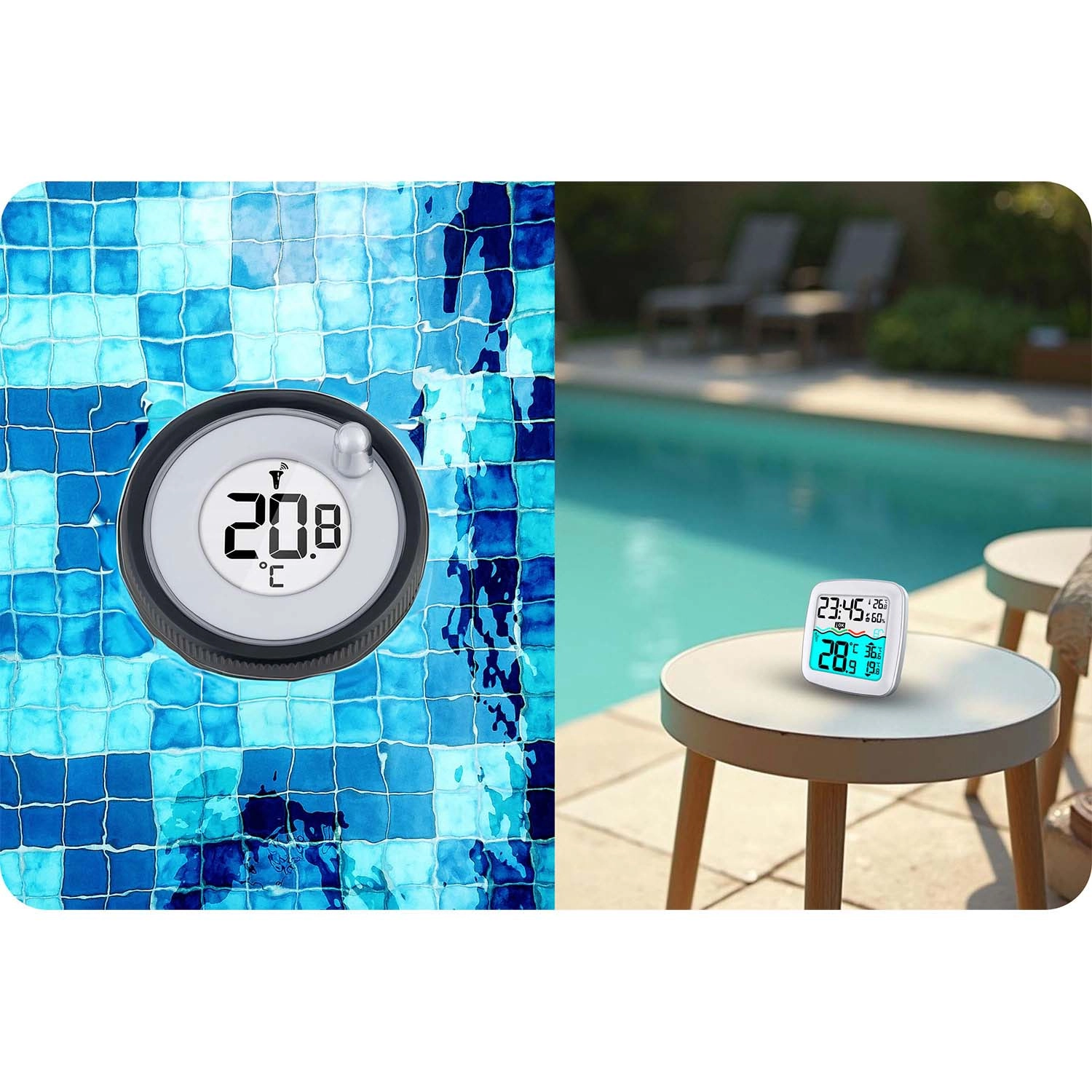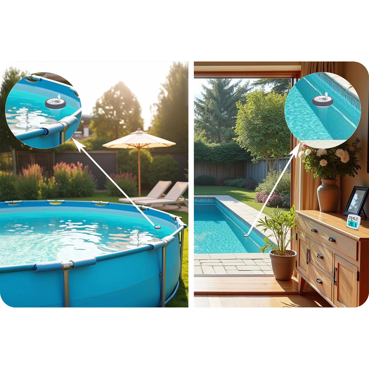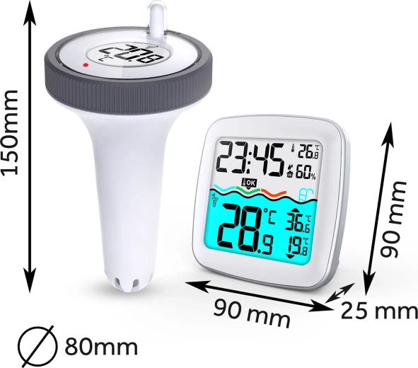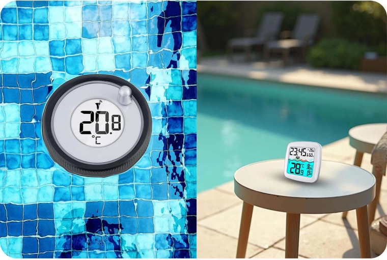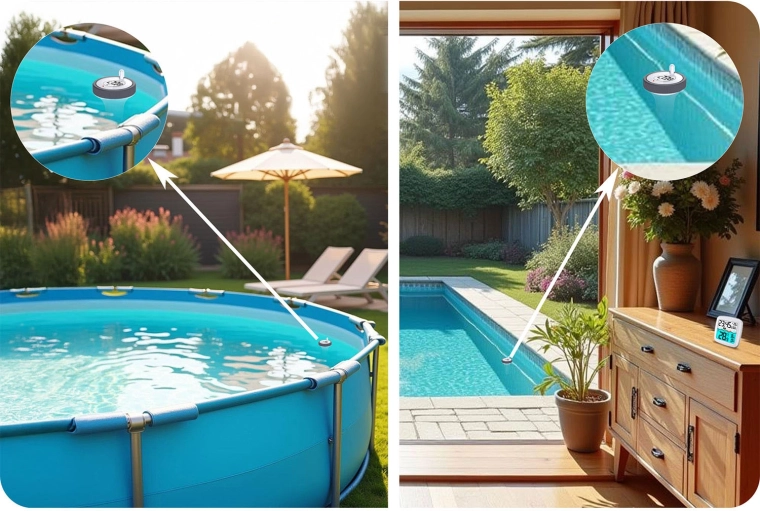 Plovoucí senzor přesně sleduje teplotu vody a odesílá data do vnitřní jednotky – ideální pro domácí bazény i vířivky.
