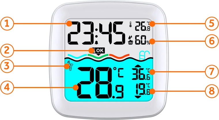 Užijte si pohodlí kompletního přehledu: vnitřní teplota a vlhkost, teplota vody v bazénu i aktuální čas řízený DCF – vše čitelně na jednom displeji. Bezdrátové propojení a možnost připojit až 3 externí čidla zajistí, že máte pod kontrolou dům, zahradu i bazén.