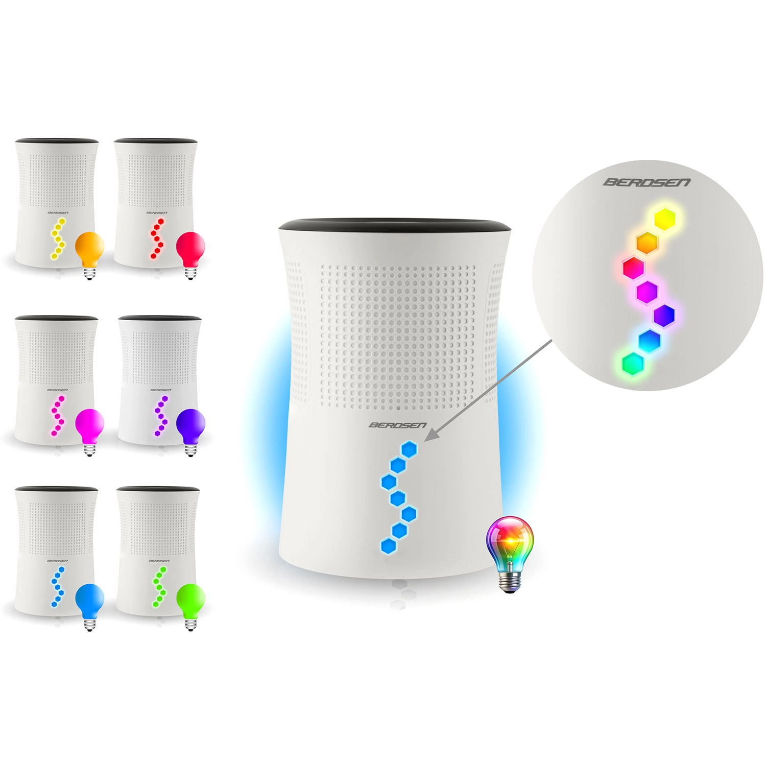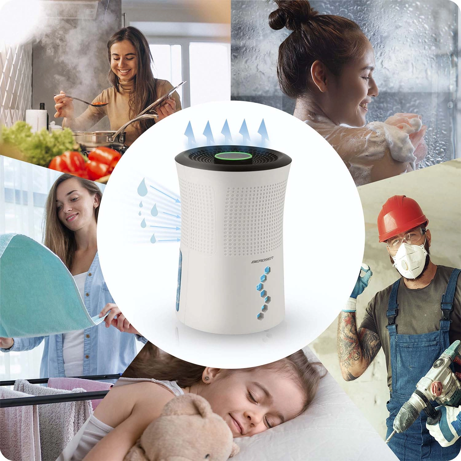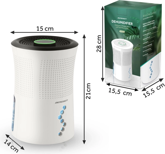 BERDSEN BD-527 je spolehlivý pohlcovač vlhkosti, který pomáhá předcházet plísním, bakteriím a zatuchlým pachům. Díky termoelektrické technologii Peltiera pracuje úsporně a tiše, takže je vhodný i do ložnic či dětských pokojů. Integrované LED podsvícení s plynulou změnou barev nebo pevným odstínem lze přizpůsobit náladě, případně zcela vypnout v nočním režimu.