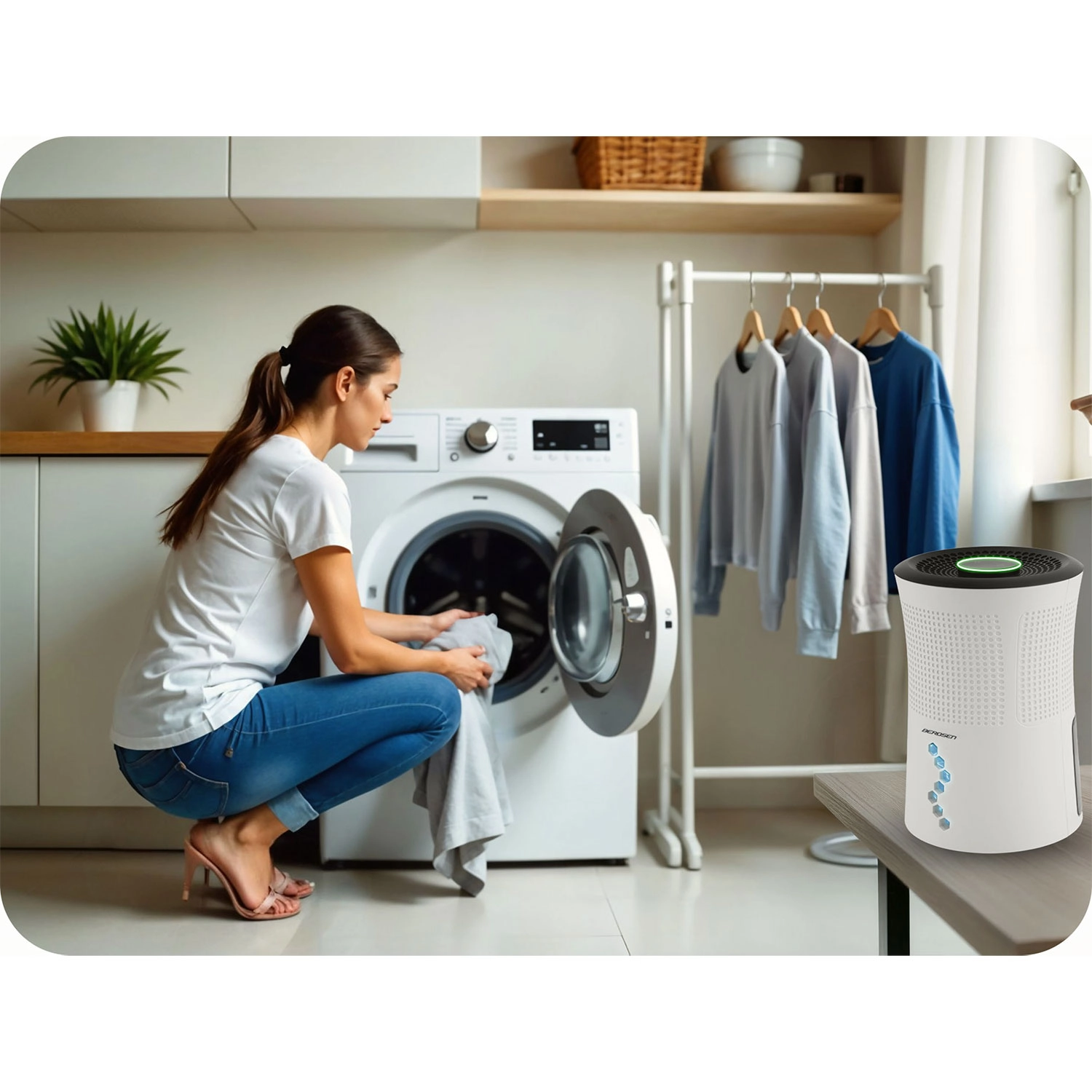 Intenzivním odebíráním vlhkosti zkracuje dobu schnutí oblečení a brání kondenzaci na stěnách i oknech – ideální do koupelen a prádelny.