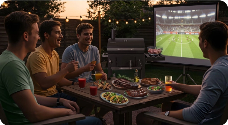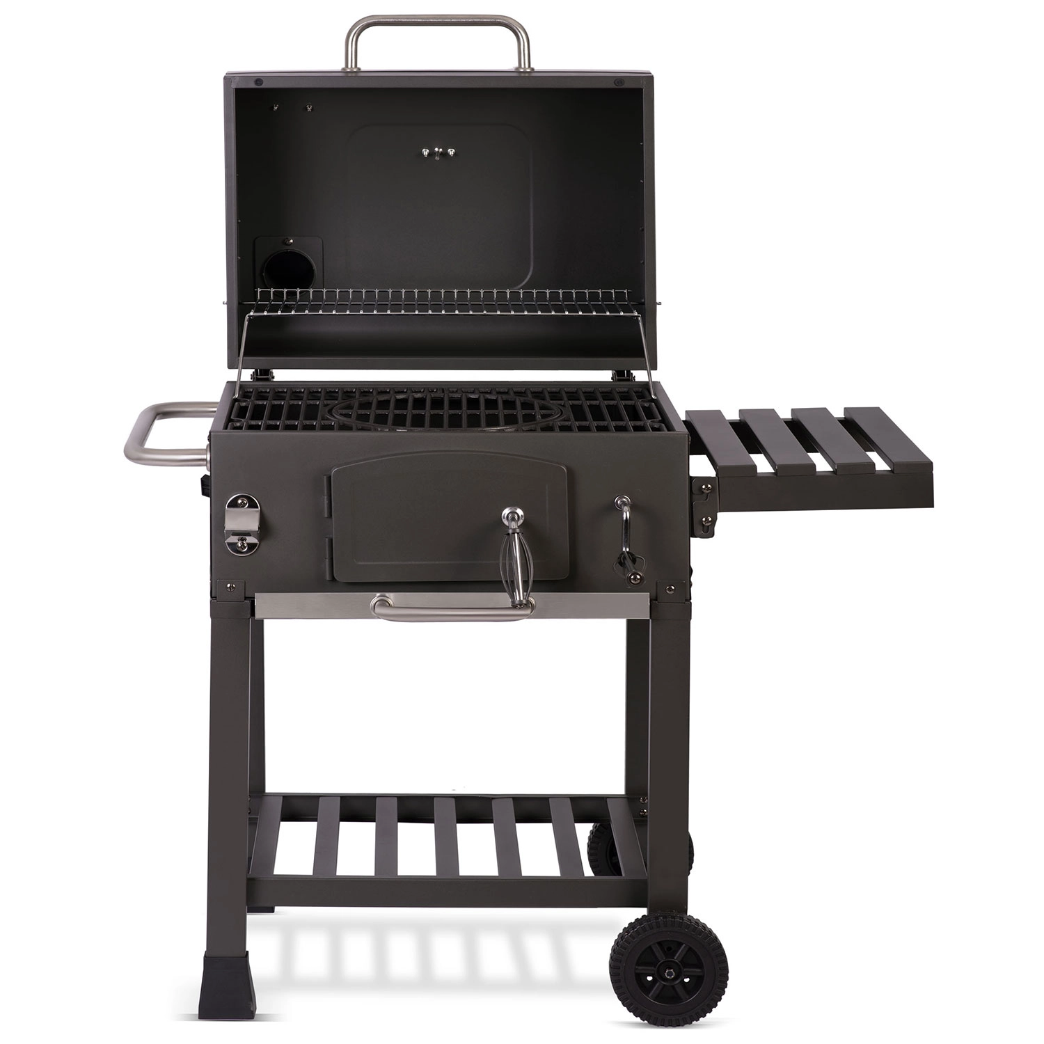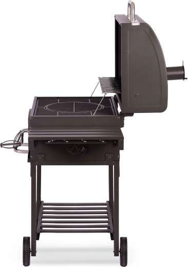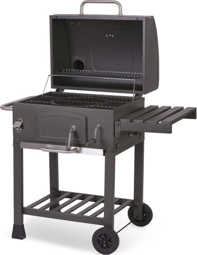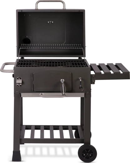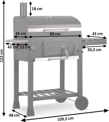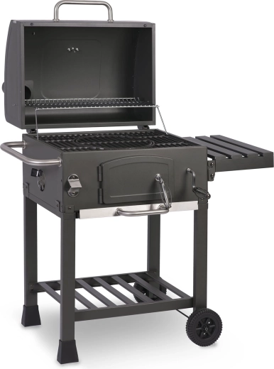 Součástí balení je kvalitní voděodolný kryt 210D Oxford s UV vrstvou a rukávem na komín, který gril ochrání před deštěm, prachem i sluncem. Praktická výbava zahrnuje přední dvířka pro přikládání uhlí, výsuvný popelník, boční polici, spodní odkládací rošt, velká pojezdová kola a dokonce otvírák na lahve pro maximální pohodlí.