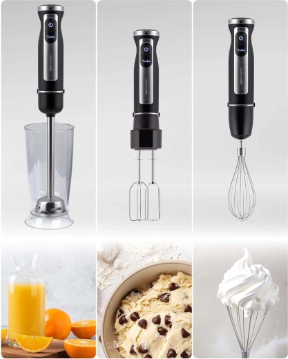 Součástí je komplexní sada příslušenství pro až 6 funkcí: základní mixovací noha, sekáček na ořechy, bylinky, maso či cibuli, šlehací metla na šlehačku a sníh, nástavec na pyré pro hladké bramborové či zeleninové pyré a mixování v odměrném kielichu/pojímané nádobě. Bezpečnost zajišťuje ochrana proti přehřátí a pojistka proti nesprávnému sestavení, takže můžete pracovat s jistotou a pohodlím.