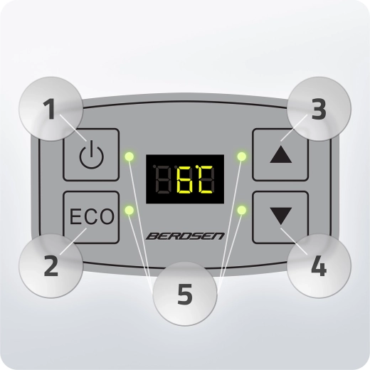 Elektronický panel, nastavení teploty, tlačítko ON/OFF, indikátory