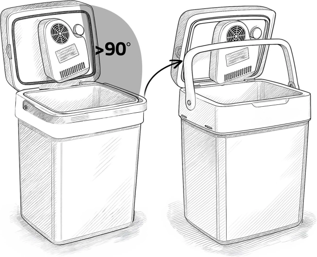 Skládací madlo se zámkem víka pro bezpečné přenášení, opěrná funkce při plnění a vyjímatelná mřížka pro přehledné uložení potravin a nápojů.