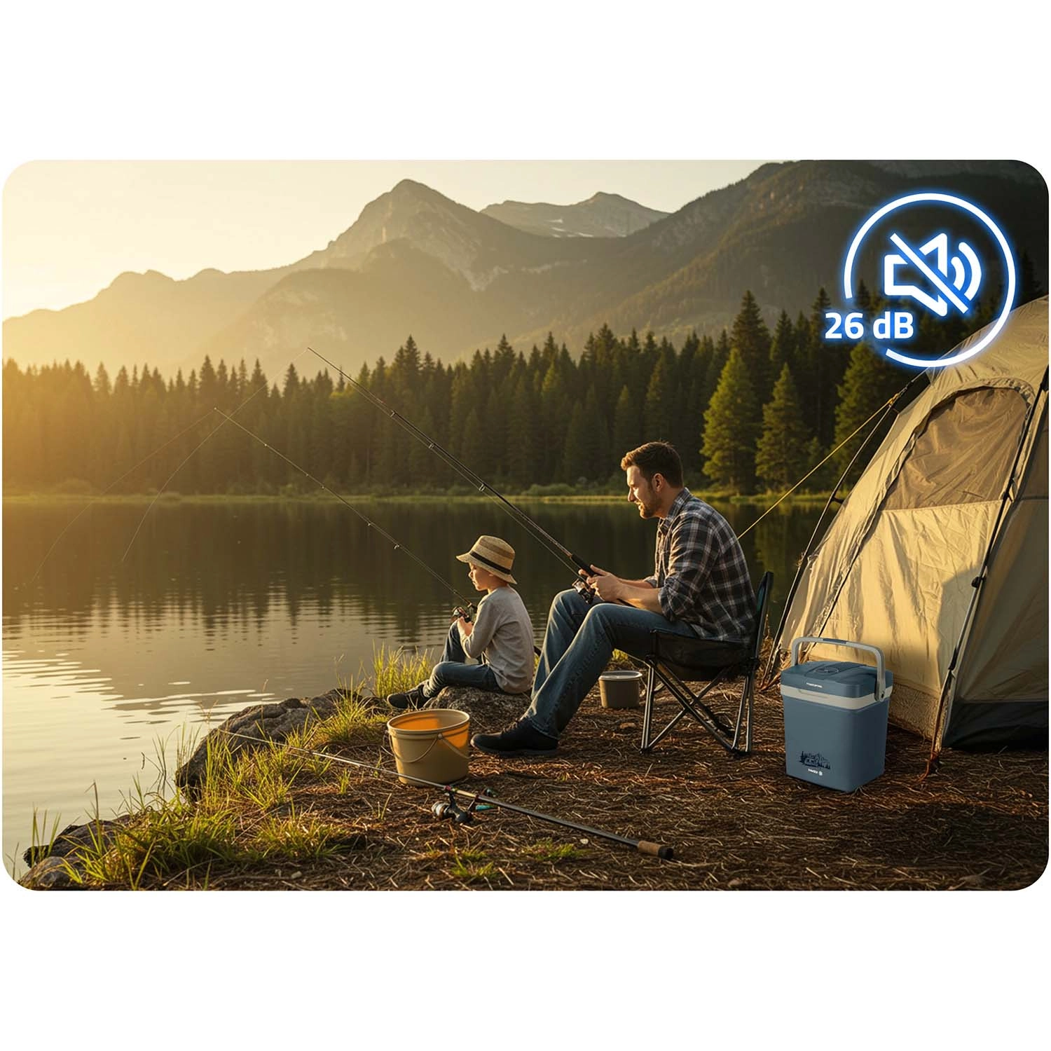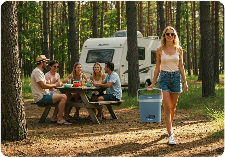 Díky napájení 12 V (auto) i 230 V (síť) je perfektní pro cestování, pikniky i delší dovolené. Víko má bezpečnostní blokaci při svislé poloze rukojeti a rukojeť lze využít jako opěru víka při plnění. Velmi tichý provoz v ECO režimu (jen 26 dB) zaručí nerušený odpočinek.