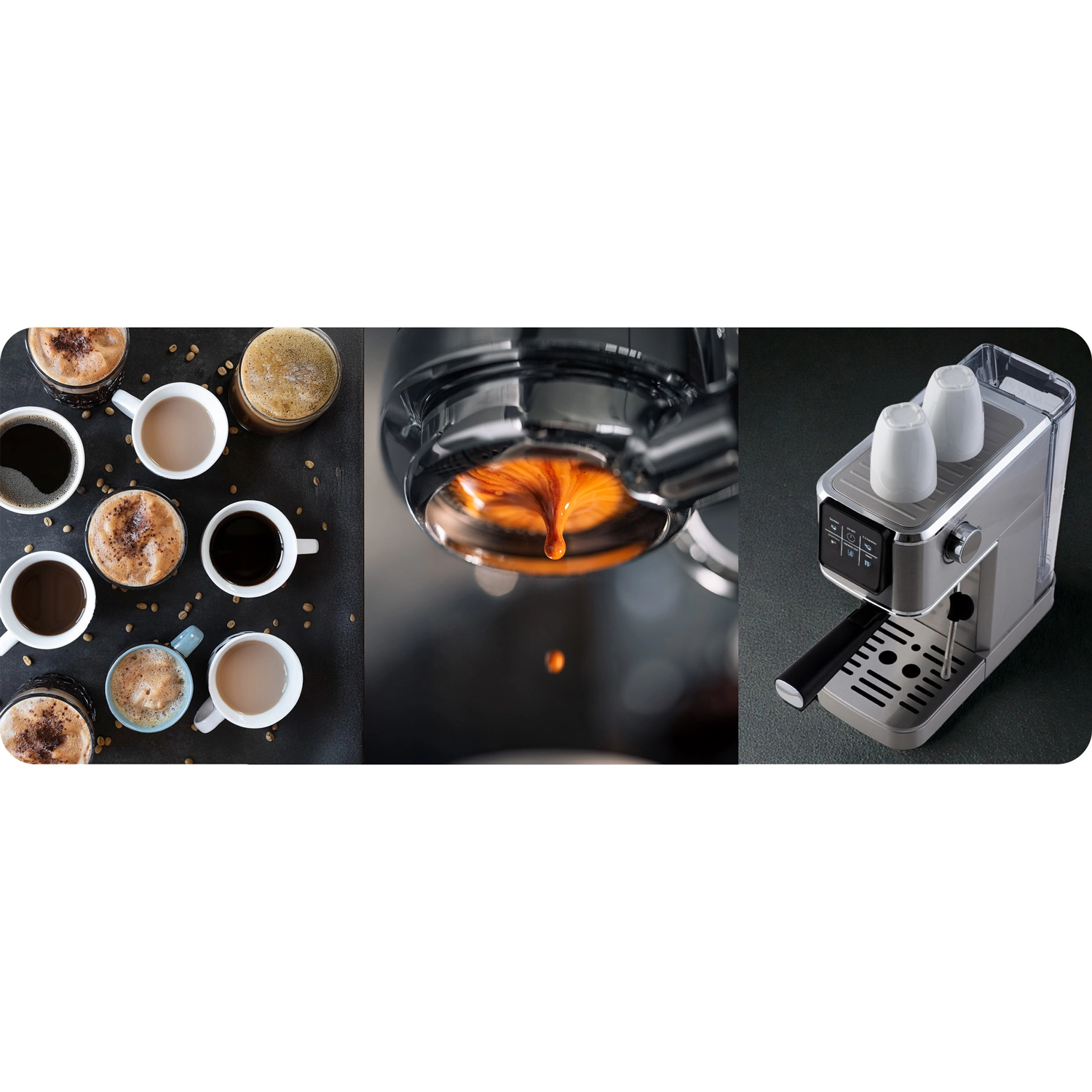 Výkonný pákový kávovar s tlakem 20 bar a příkonem 1350 W pro intenzivní aroma a bohatou cremu jako z kavárny. Dotykový panel usnadní ovládání, profesionální parní tryska vytvoří hedvábnou mléčnou pěnu a vyjímatelná nádržka na vodu 1,2 l zajistí pohodlí při každodenním používání. Navíc potěší funkce cold espresso pro ledové kávové speciality a tiché, spolehlivé provedení z nerezové oceli.