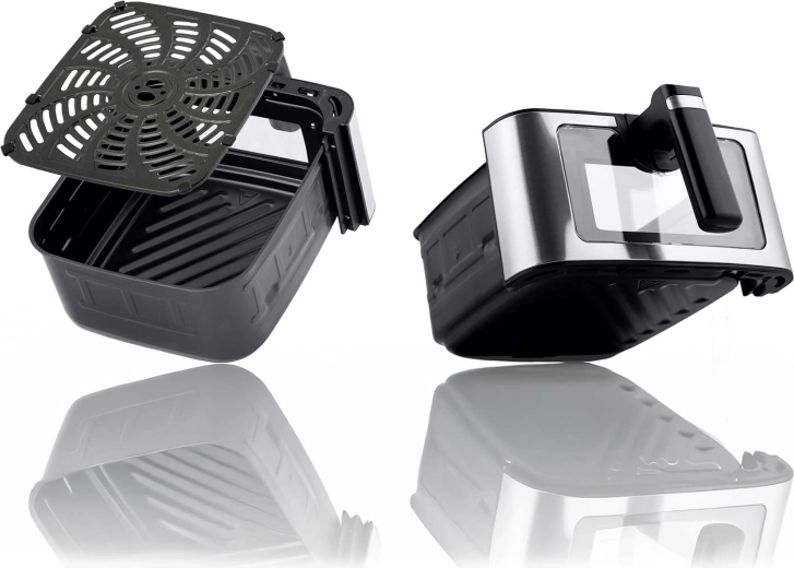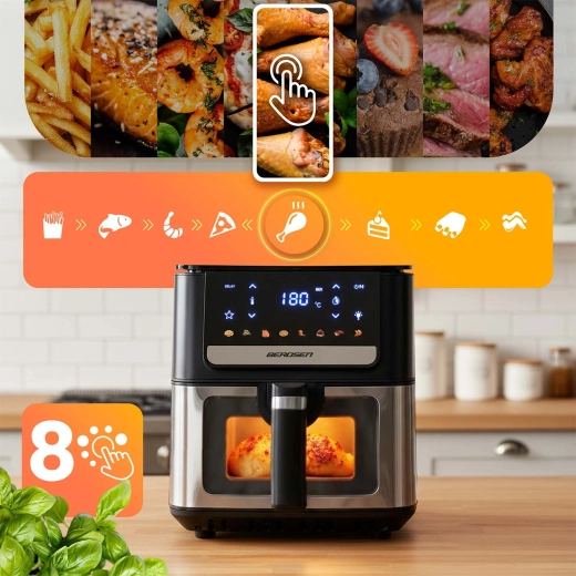 Ovládání je maximálně jednoduché díky dotykovému panelu s 8 automatickými programy (hranolky, ryby, kuře, krevety, steaky, koláč, pizza, křidélka). Okénko v koši a LED osvětlení umožní kontrolu přípravy bez otevírání zásuvky. Nastavte si čas 1–60 min a teplotu až 200 °C, využijte připomenutí k otočení pokrmu a těšte se na konzistentně skvělé výsledky.