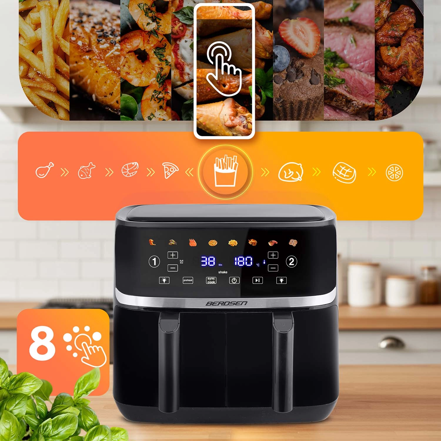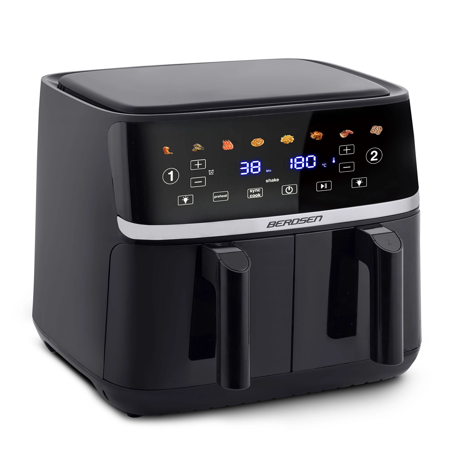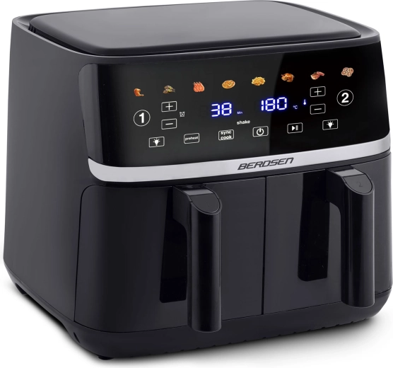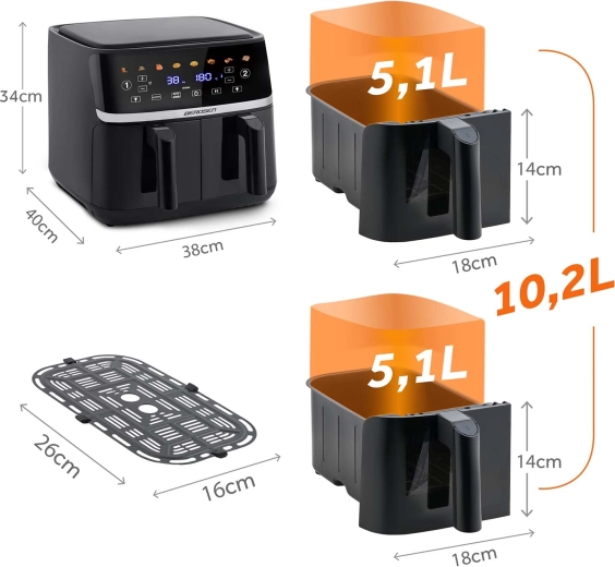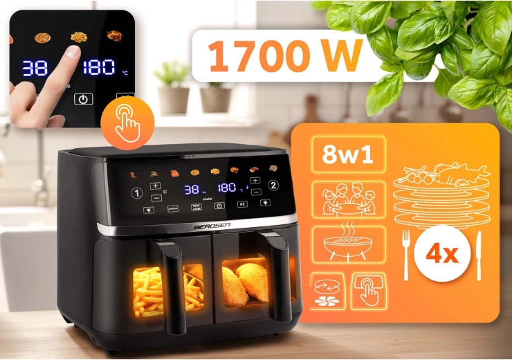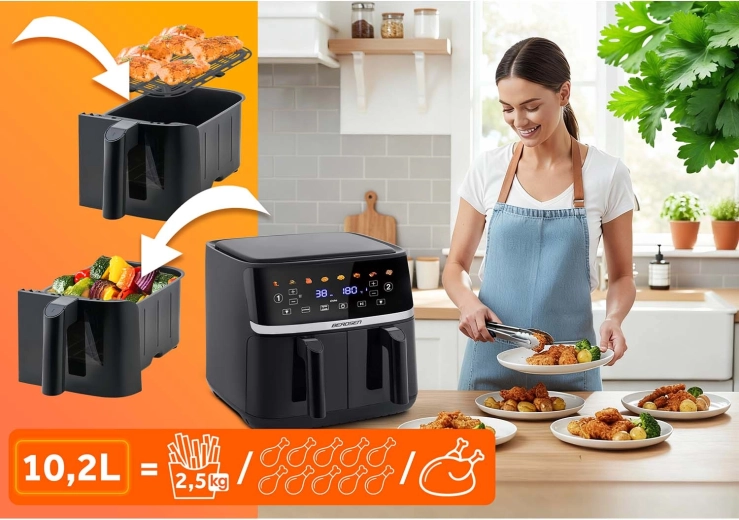 Objevte pohodlné a zdravější vaření s horkovzdušnou fritézou BERDSEN s objemem 10,2 l a dvojitou komorou (2 × 5,1 l). Díky výkonu 1700 W, 8 automatickým programům a dotykovému ovládání připravíte křupavé hranolky, šťavnaté maso i zeleninu s až o 90 % méně tuku. Praktická okénka s LED podsvícením vám umožní sledovat průběh pečení bez otevírání a funkce předehřevu, odloženého startu a upozornění na otočení dělají z vaření hru.