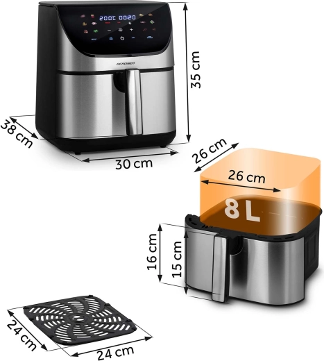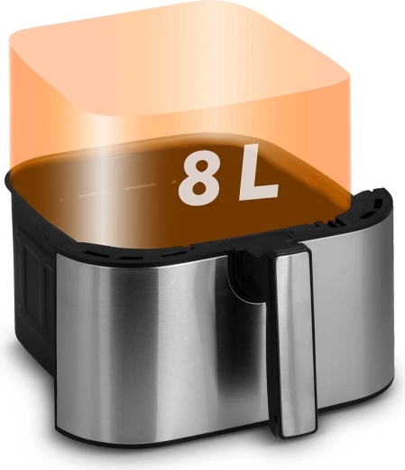 Díky pokročilé cirkulaci horkého vzduchu získáte zlatavou, křupavou kůrku zvenčí a šťavnatost uvnitř – bez zápachu po oleji a zbytečných kalorií. Objem 8 litrů stačí na oběd pro celou rodinu, velkou porci hranolků pro přátele i na pečení celého kuřete. Vnitřní díly s nepřilnavou úpravou PTFE můžete mýt v myčce.