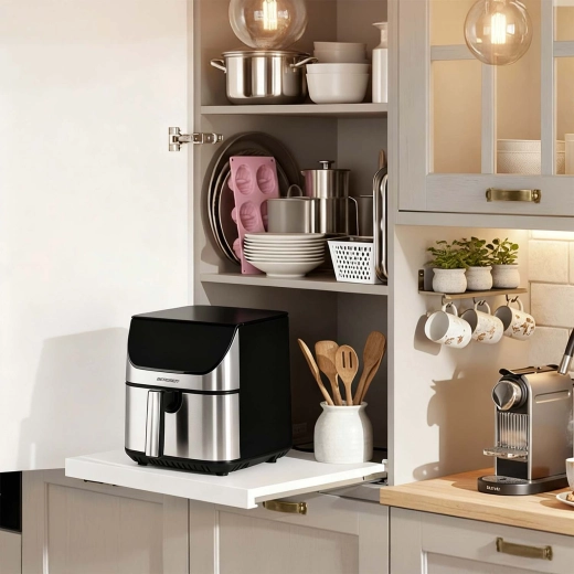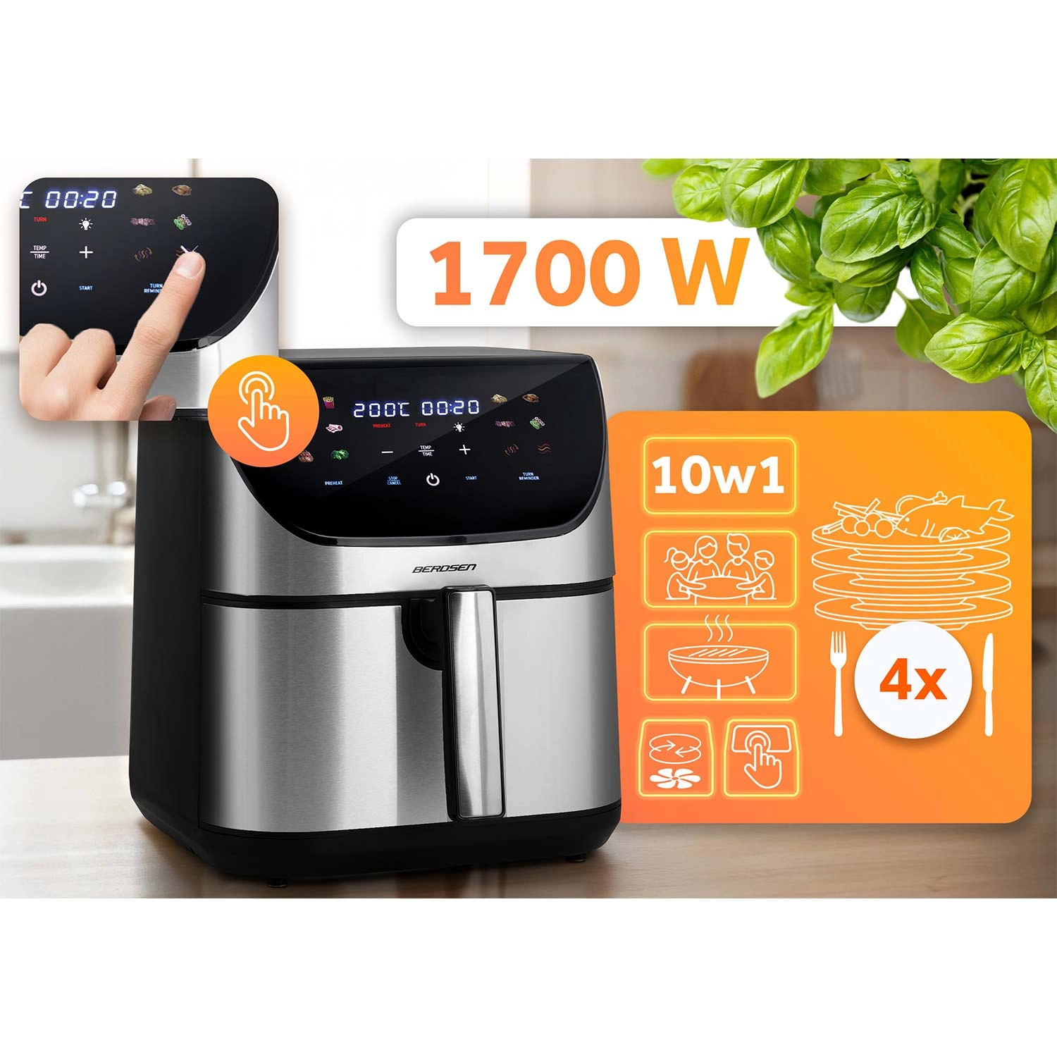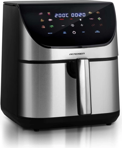 Větší kapacita, méně tuku a maximální pohodlí – horkovzdušná fritéza BERDSEN 8 l s výkonem 1700 W připraví křupavé hranolky, šťavnaté kuře i pečenou zeleninu téměř bez oleje. Nabízí 12 automatických programů, dotykový panel s podsvícením, nastavení teploty až 200 °C a připomenutí otočení pokrmu. Nerezové provedení se snadno čistí a skvěle zapadne do každé kuchyně.
