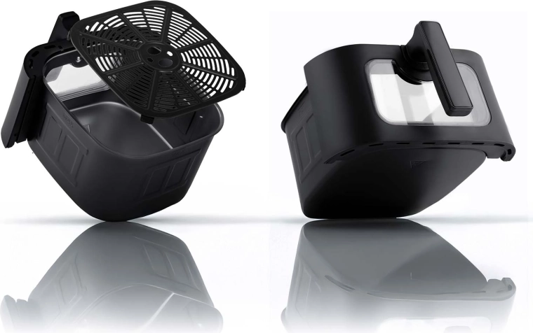 Vyjímatelný koš a perforovaný tácek lze mýt v myčce. Nepřilnavé povrchy s PTFE usnadní čištění a zlepší proudění horkého vzduchu.