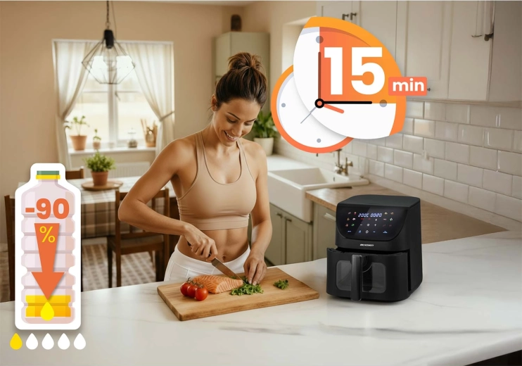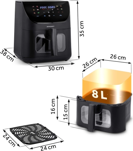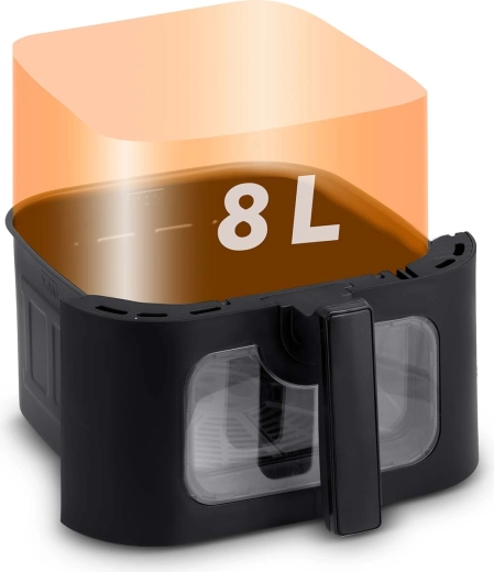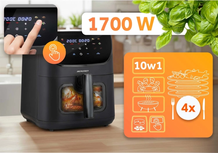 BERDSEN přináší do vaší kuchyně moderní technologii a praktičnost. Díky velké kapacitě 8 litrů zvládnete oběd pro rodinu, celé kuře i porci hranolků pro přátele. Regulace teploty 80–200 °C a časovač 1–60 min zajišťují přesné výsledky bez odhadování. Dotykový ovládací panel s přehlednými ikonami a okénko s LED podsvícením vám dají plnou kontrolu nad přípravou.