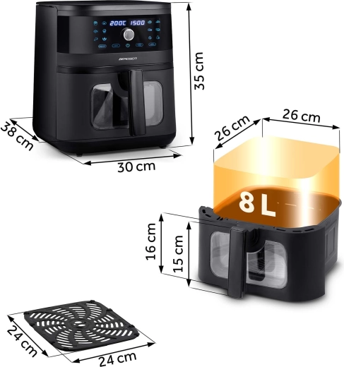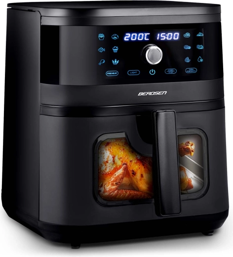 BERDSEN BD-661 je více než jen fritéza. Díky cirkulaci horkého vzduchu připraví jídlo křupavé zvenčí a šťavnaté uvnitř s minimem oleje. Velká kapacita 8 l je ideální pro rodinné obědy, celé kuře nebo pořádnou porci hranolků. Dotykový panel s přehlednými ikonami a okénko s LED světlem zajišťují pohodlnou obsluhu i kontrolu pečení bez zbytečného otevírání koše.