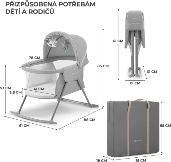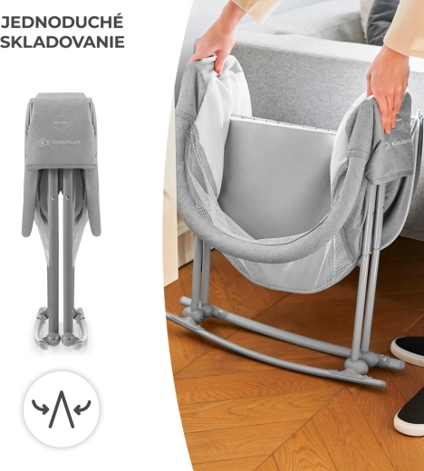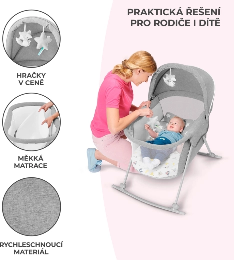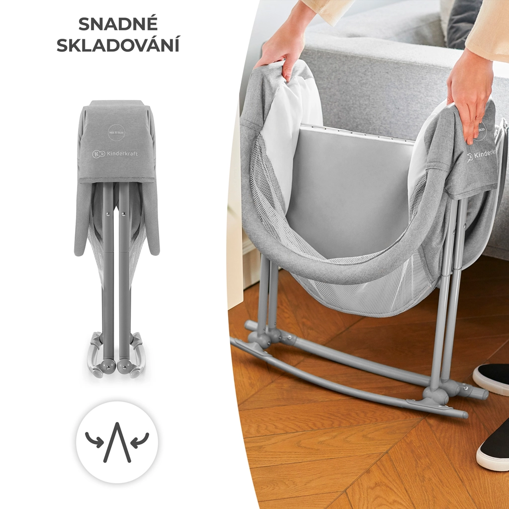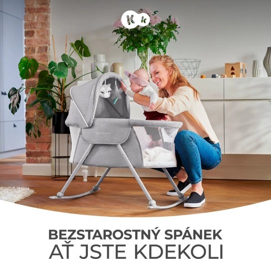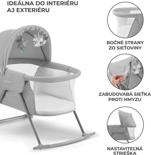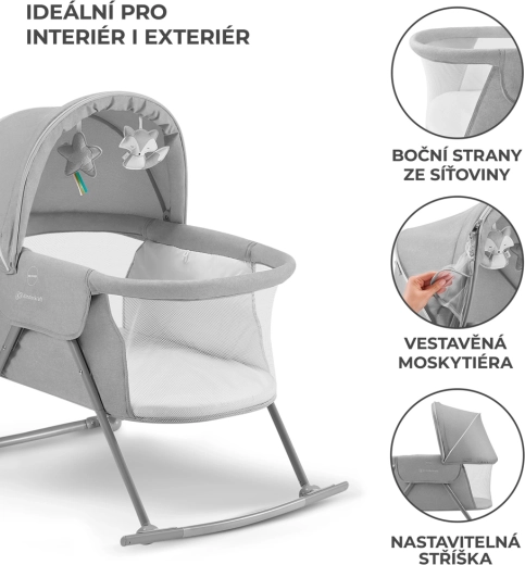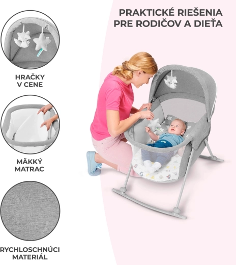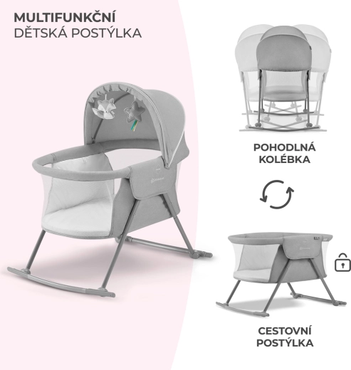 Praktická postýlka 3v1 KINDERKRAFT Lovi slouží jako postýlka, kolébka i cestovní postýlka. Je lehká a kompaktní, s rychlým skládáním bez nářadí, má houpací funkci, odnímatelnou stříšku s integrovanou moskytiérou a prodyšné síťované boky pro bezpečné a pohodlné spaní miminka od narození do 9 kg.