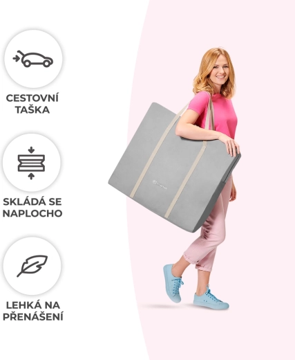 Postýlka se rychle skládá bez potřeby nářadí a vejde se do přiložené přepravní tašky – ideální volba pro každodenní použití doma i na cestování. Výrobek je testován podle normy EN 1130, takže splňuje evropské bezpečnostní požadavky.