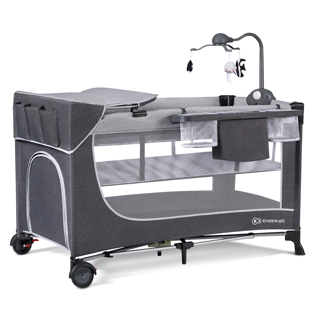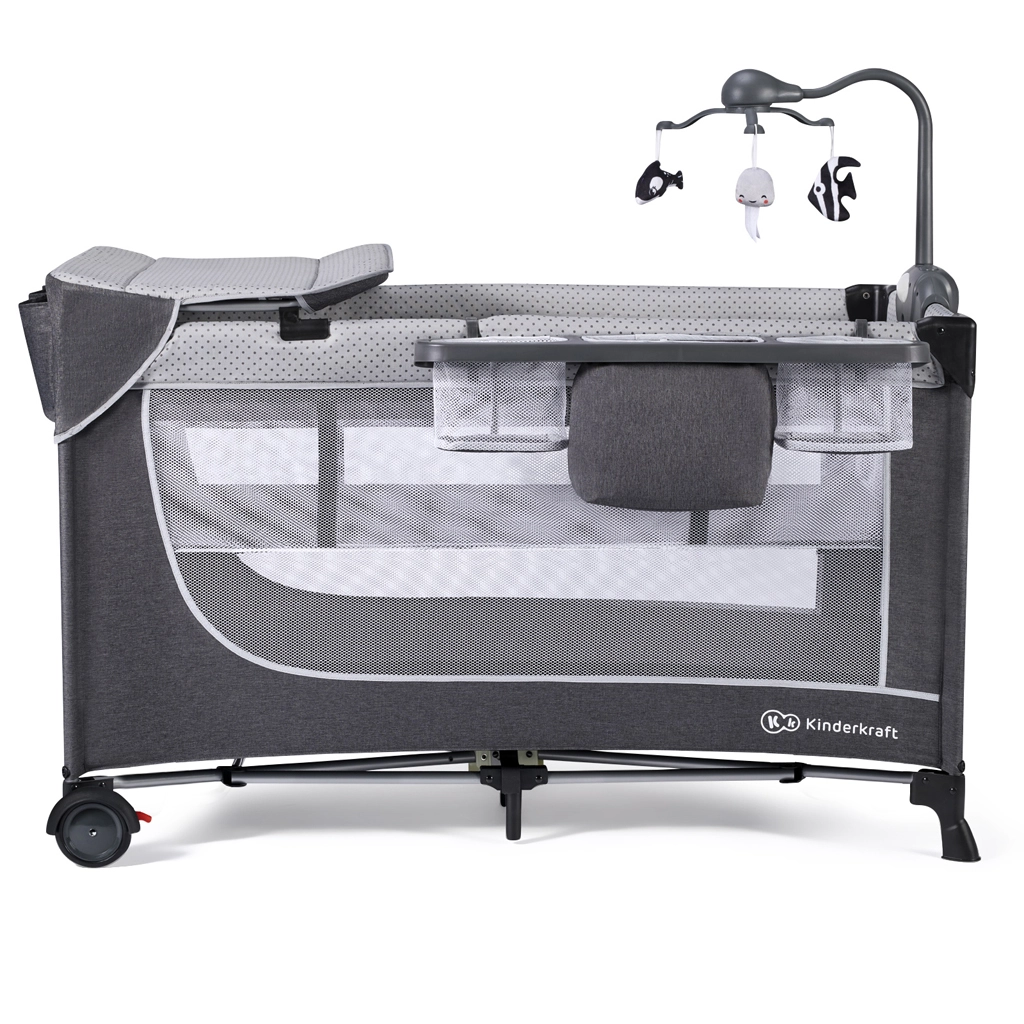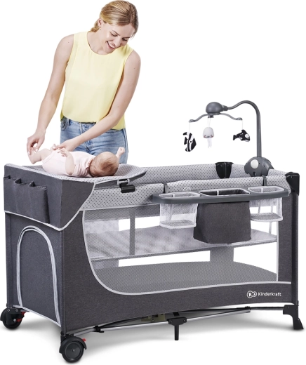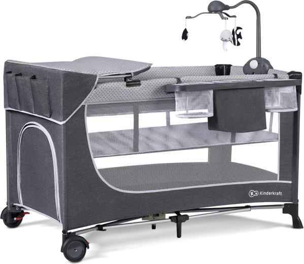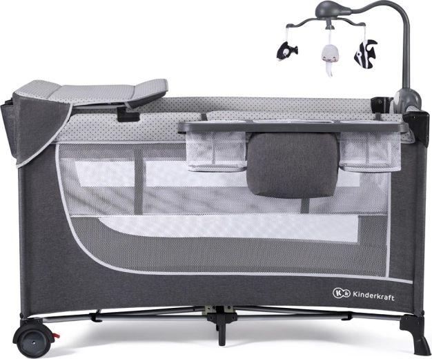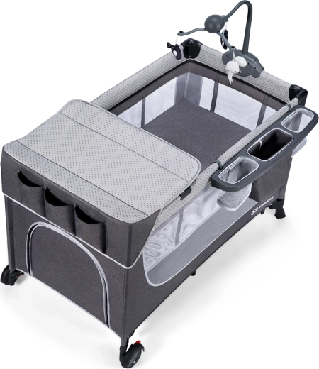 Součástí je přebalovací pult, kolotoč s hračkami a chytré úložné kapsy. Vše potřebné máte po ruce a dítě v bezpečí vedle vás.