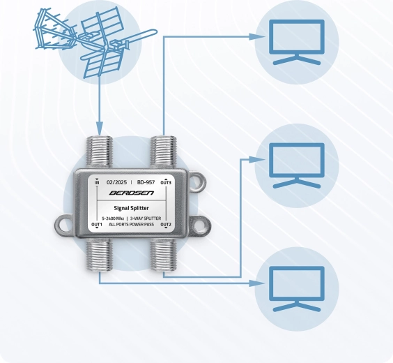 Jedna anténa – tři nezávislé přijímače. Tento 3cestný pasivní anténní splitter efektivně rozdělí signál z antény, satelitu nebo kabelové TV do tří výstupů bez nutnosti dalších zařízení. Díky funkci All Ports Power Pass snadno napájíte anténní zesilovač nebo LNB přímo po koaxiálním vedení.