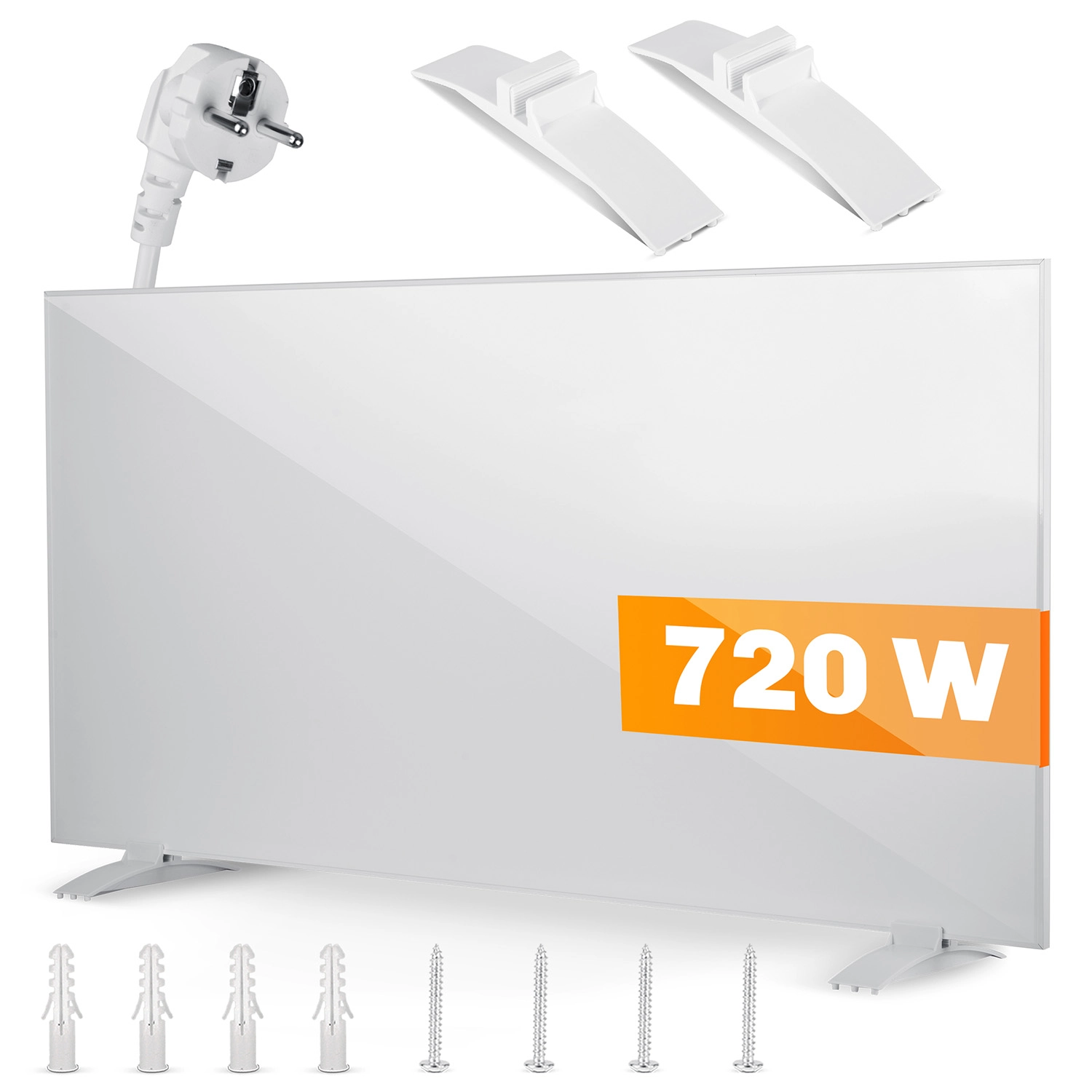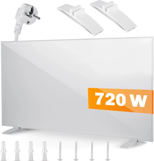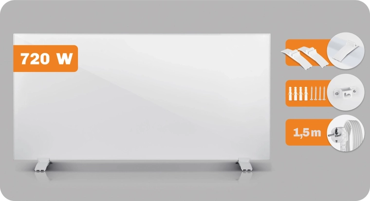 Obsah balení: panel 720 W, 2× hliníkové nohy pro volně stojící použití, příslušenství pro nástěnnou montáž, návod (PL).