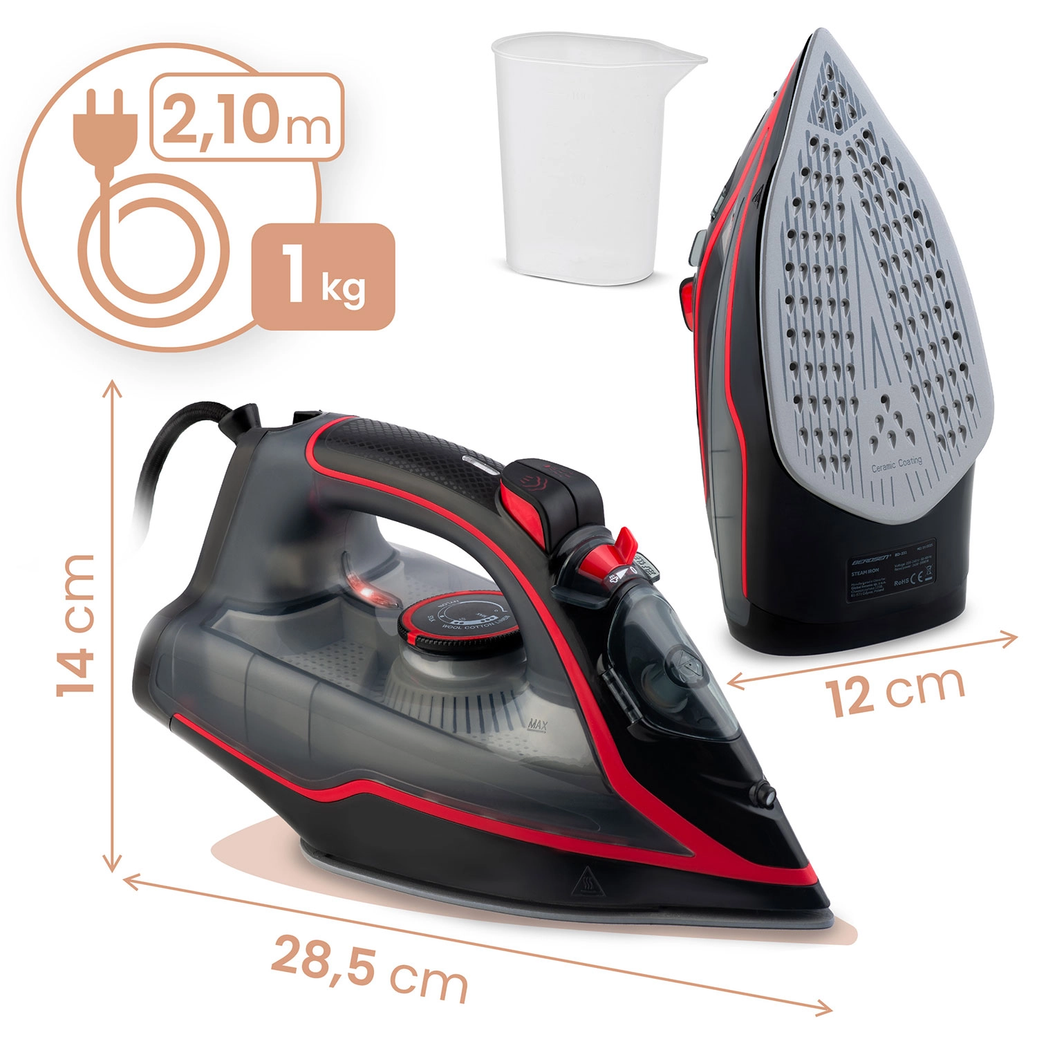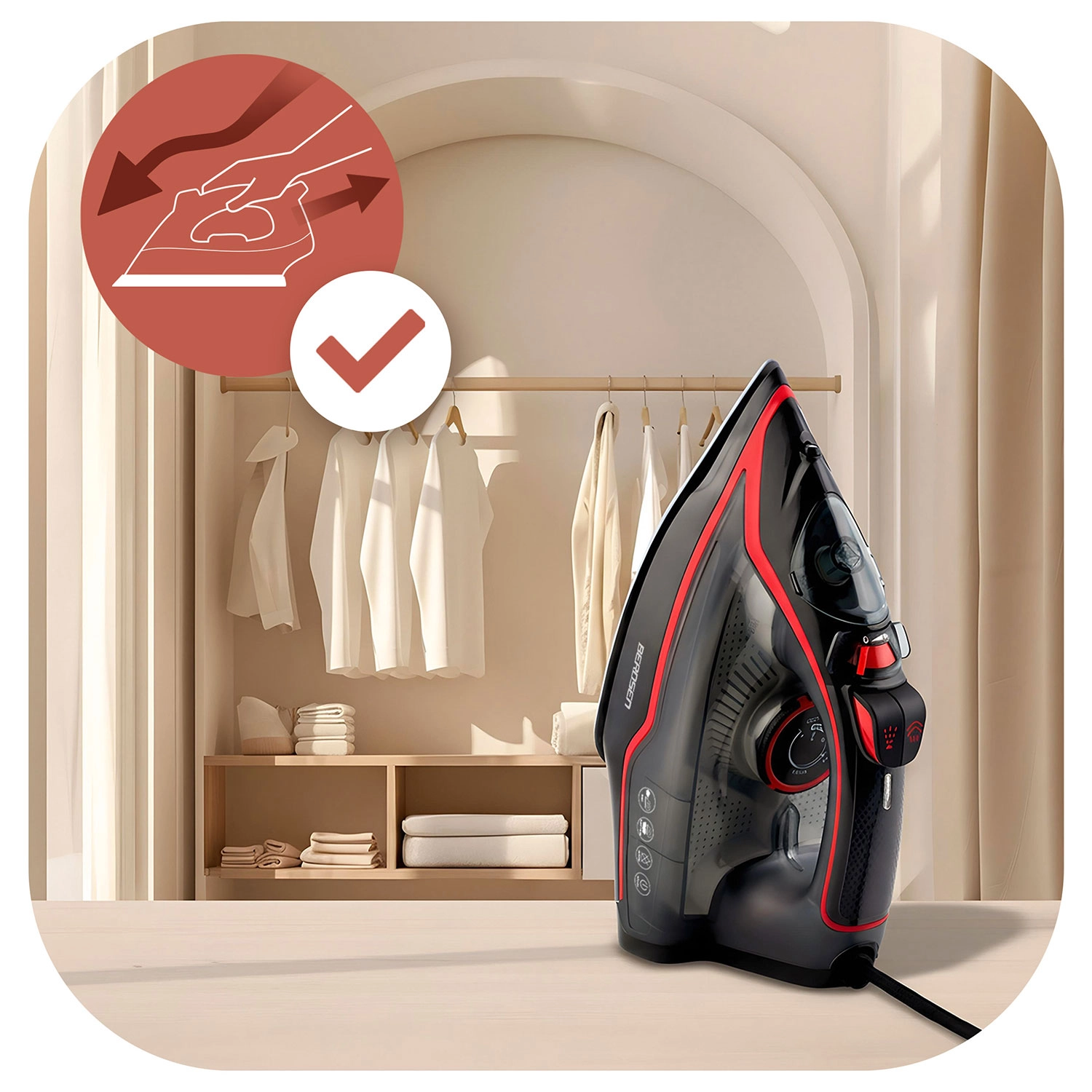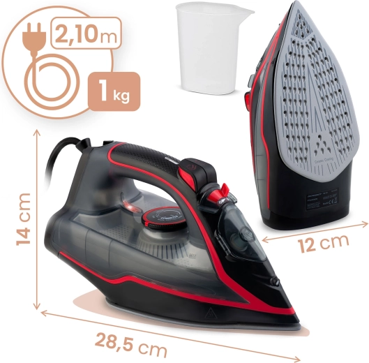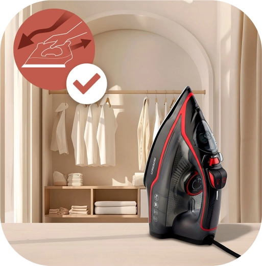- Keramická žehlící plocha – hladký skluz, rovnoměrná pára a odolnost proti poškrábání.