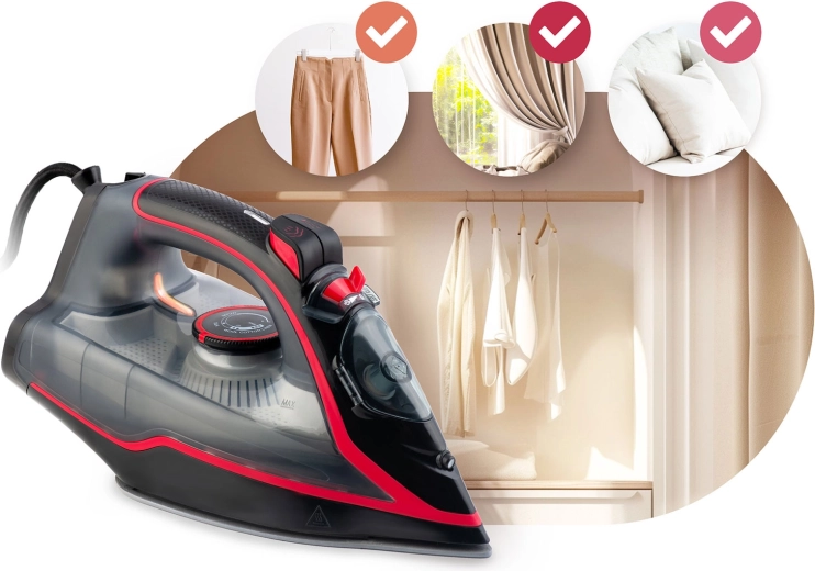 - Vertikální napařování – rychlé osvěžení oděvů, záclon a závěsů bez žehlicího prkna.