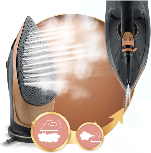 Hladké klouzání, rovnoměrná distribuce páry a snadné žehlení i v hůře dostupných místech díky přesné špičce.