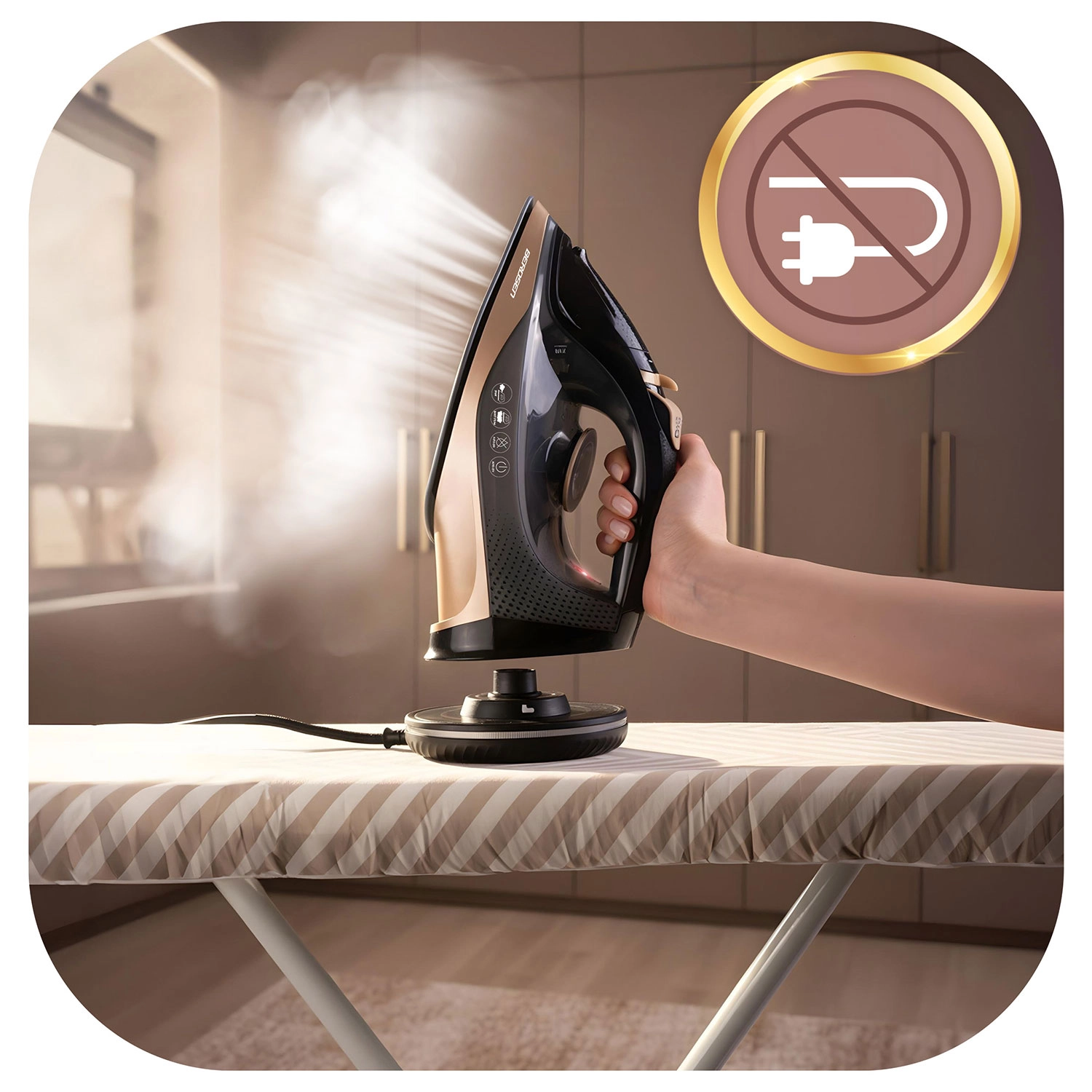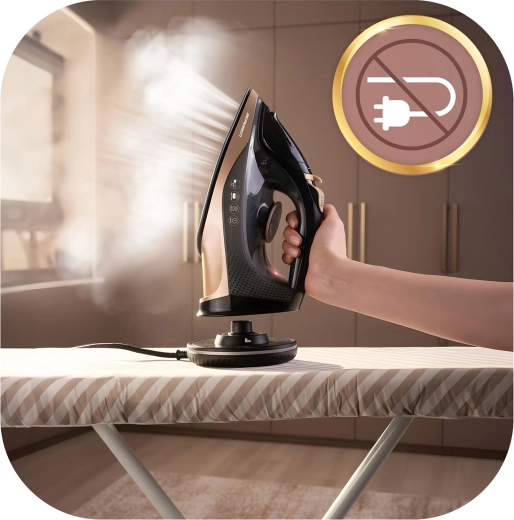 Používejte žehličku volně bez kabelu nebo uzamkněte základnu a žehlete jako s klasickým modelem – vždy stabilní teplota a plynulá práce.