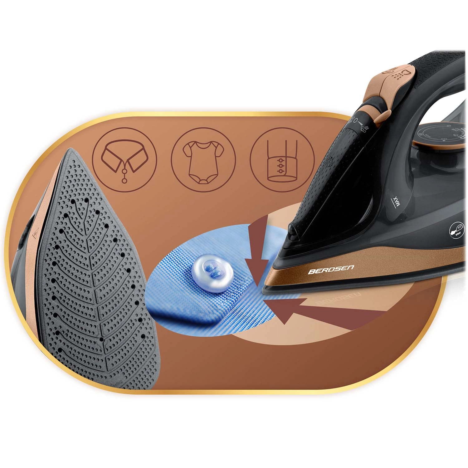 Žehlička Berdsen kombinuje silný výkon 2600 W a hladkou keramickou plochu s mikrokanálky pro rovnoměrnou distribuci páry. S vertikálním napařováním vyžehlíte záclony či oděvy na ramínku bez nutnosti žehlícího prkna. Nádržka na vodu o objemu 320 ml a praktický sprchovač umožňují cílené zvlhčení i těch nejodolnějších záhybů.