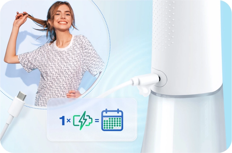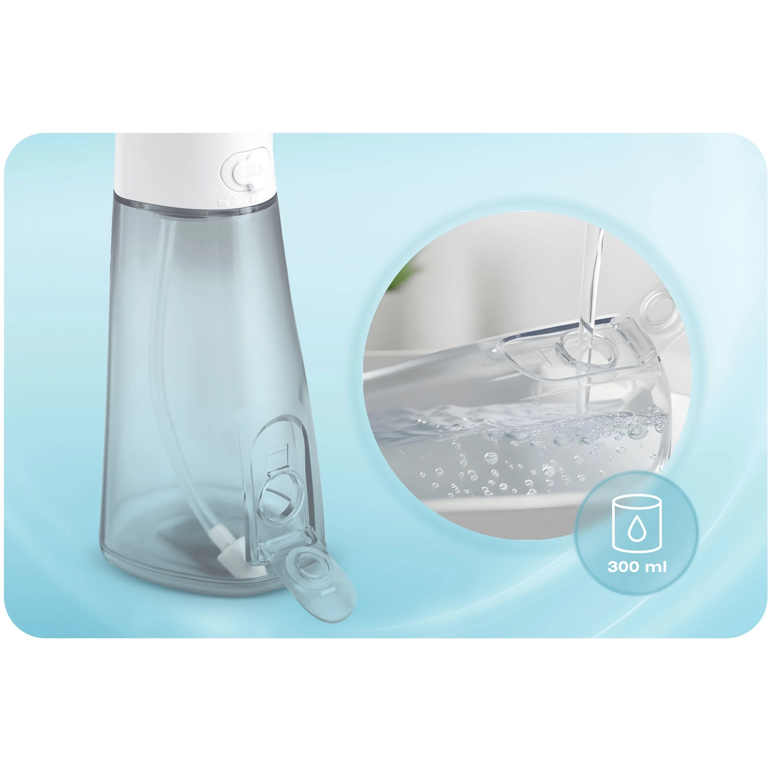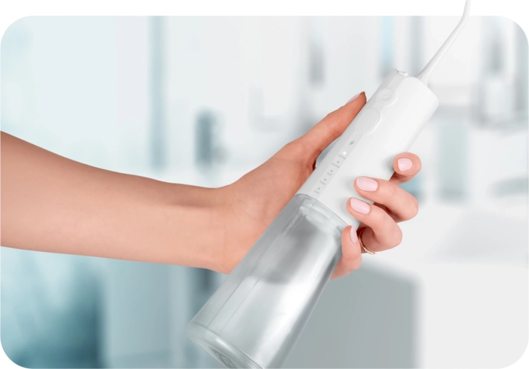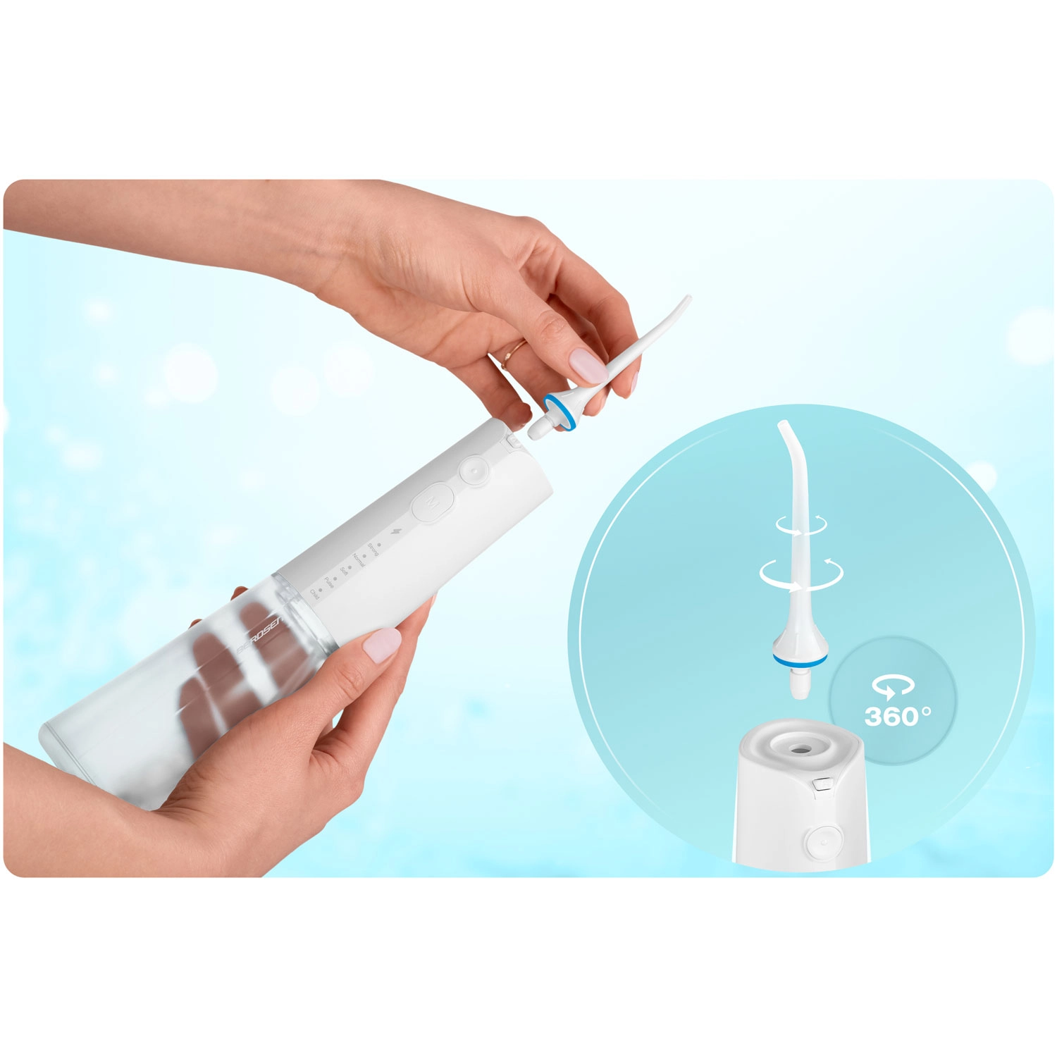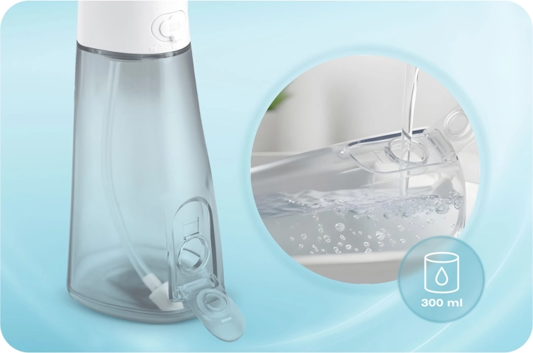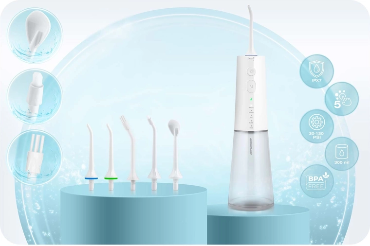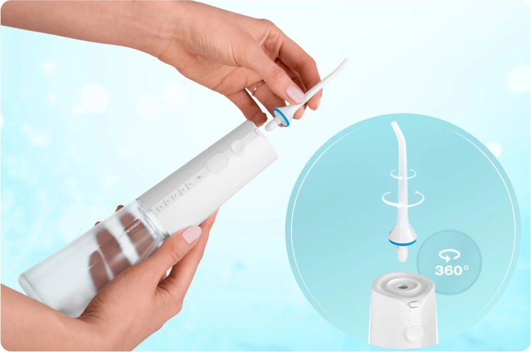 V balení najdete pět nástavců pro kompletní hygienu ústní dutiny: standardní trysky pro každodenní použití, nástavec na jazyk pro svěží dech, ortodontickou trysku pro rovnátka a speciální trysku pro čištění parodontálních kapes (doporučeno používat při nízkém tlaku). Otočná hlavice 360° usnadňuje dosažení všech míst v ústech a voděodolnost IPX7 zvyšuje bezpečnost použití v koupelně.