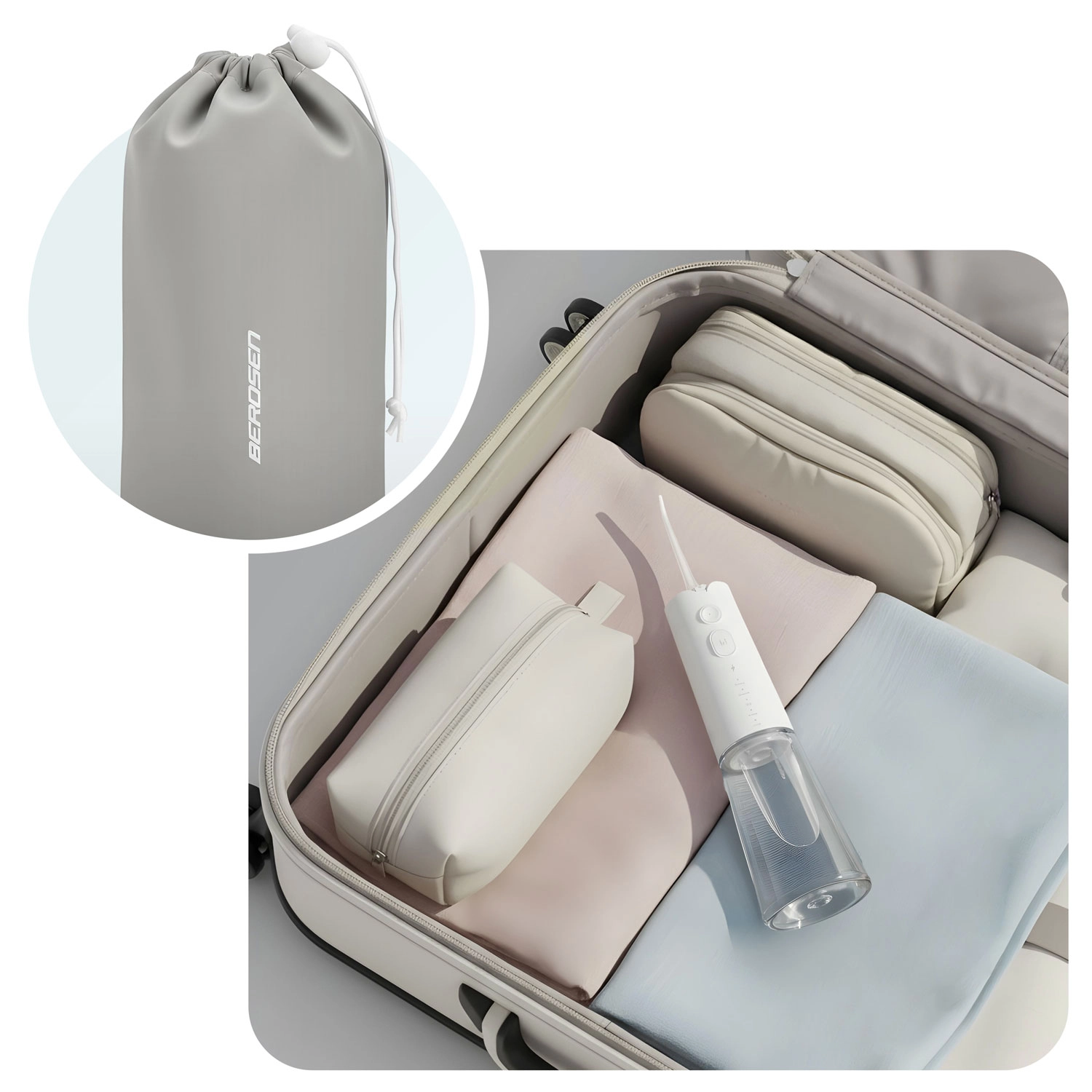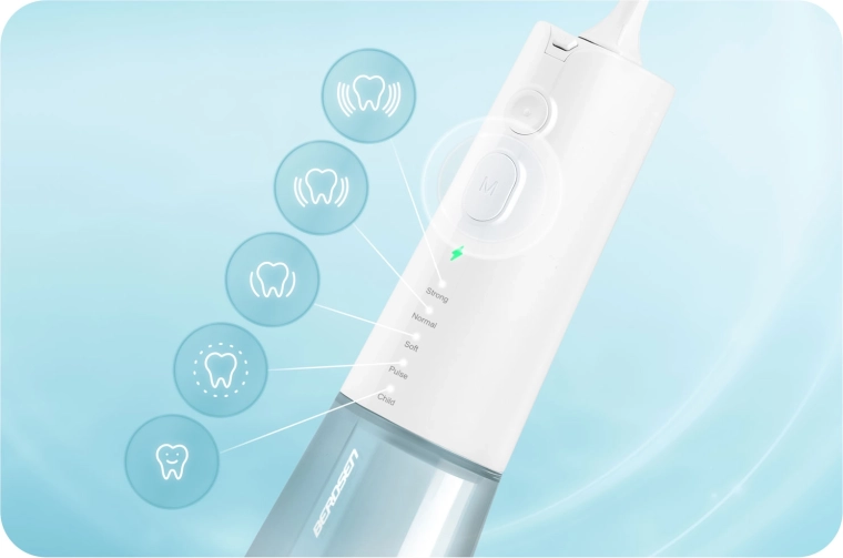Bezdrátový irigátor Berdsen účinně odstraňuje nečistoty a zbytky jídla z mezizubních prostor a podél linie dásní pomocí silného, ale šetrného vodního paprsku. Pět režimů (Strong, Normal, Soft, Pulse, Child) vám umožní přizpůsobit tlak a rytmus čištění citlivým dásním, nosičům rovnátek i dětem. Větší nádržka o objemu 300 ml zajišťuje delší čištění bez častého dolévání vody.