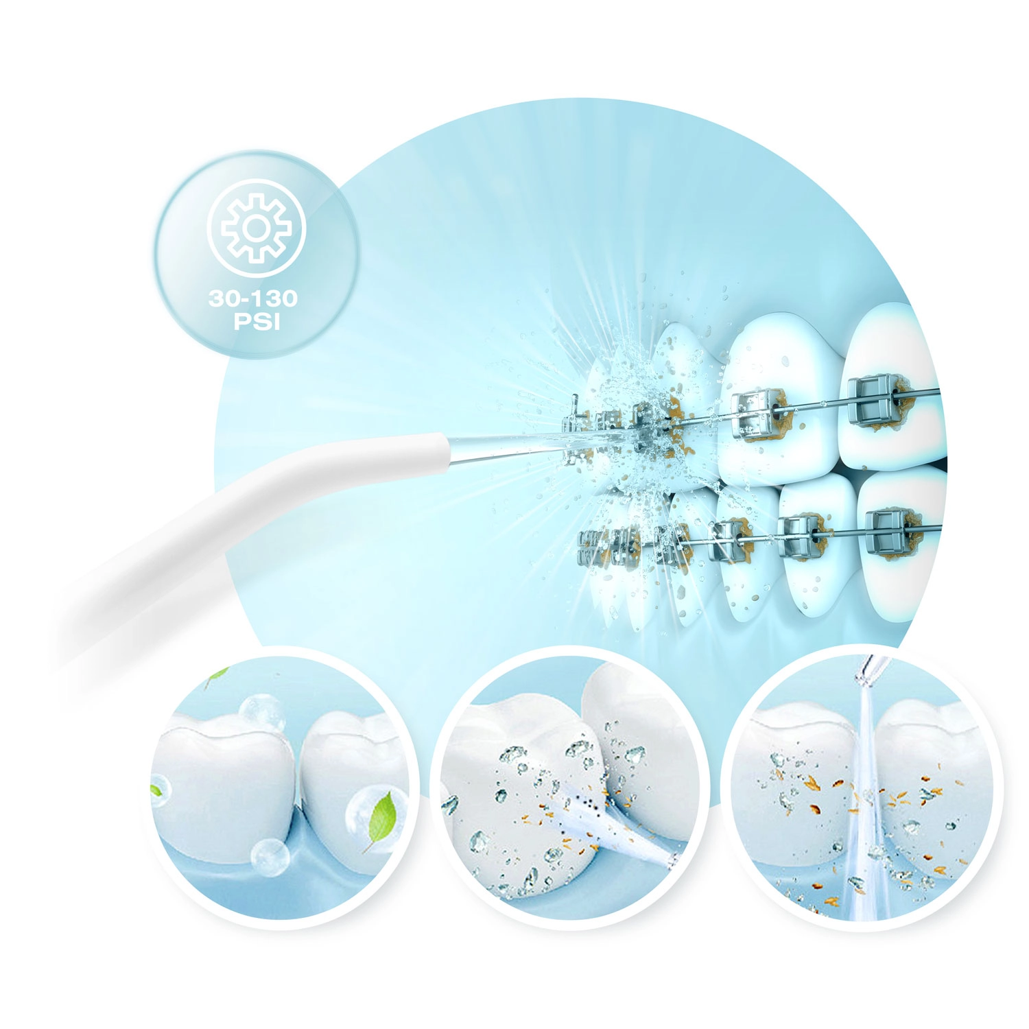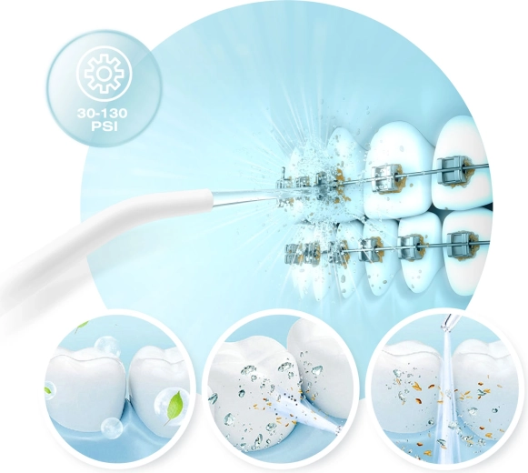 - Silný výkon až 130 PSI a 1800 pulzů/min pro důkladné odstranění plaku.