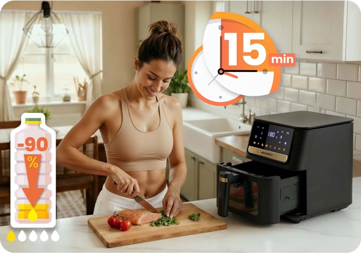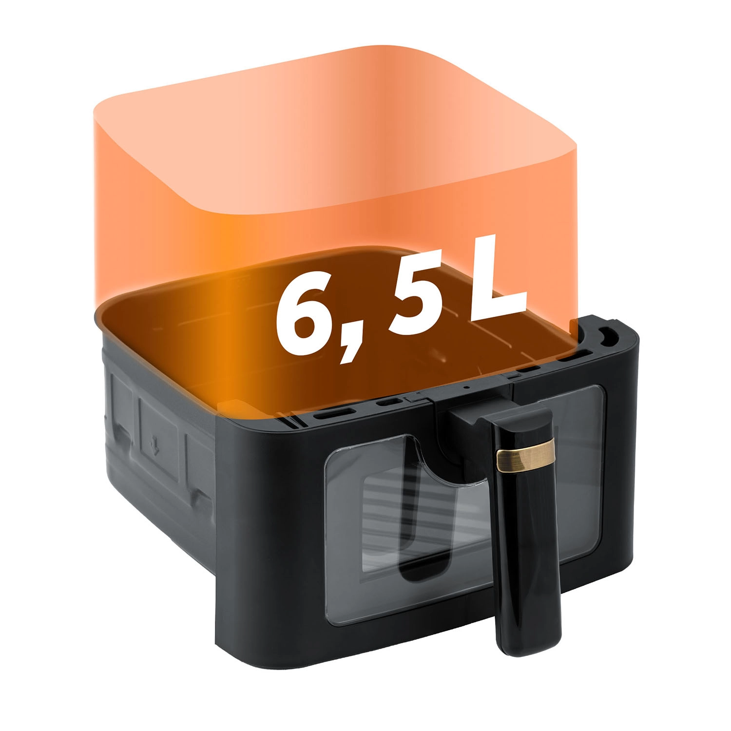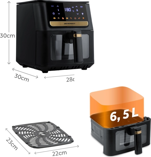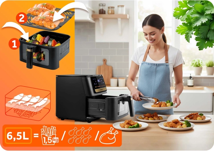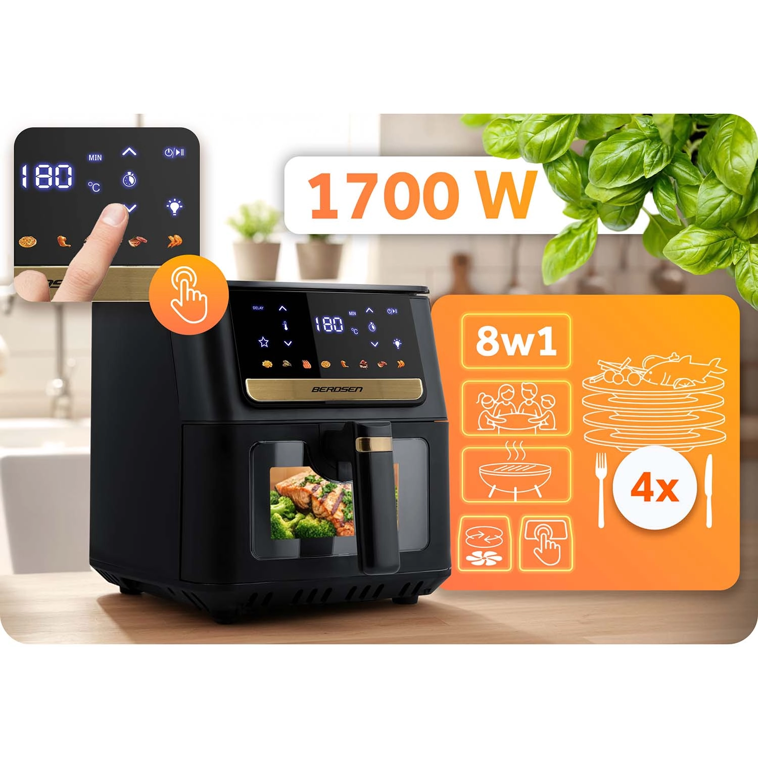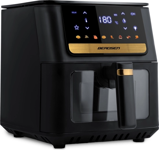 Horkovzdušná fritéza BERDSEN přináší rychlou a rovnoměrnou přípravu oblíbených pokrmů bez zbytečného oleje. Velký koš 6,5 l pojme porci pro celou rodinu – od hranolků, křidélek a steaků až po celého kuřete. LED podsvětlení a průhledové okénko vám umožní mít vše pod kontrolou bez přerušení pečení, zatímco dotykový displej nabízí jasné ikony a předvolby pro snadnou volbu programu.