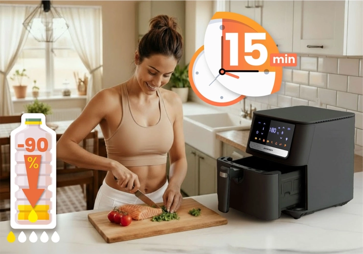Užijte si oblíbené chutě v „light“ verzi – se zlatavou kůrkou zvenku a šťavnatostí uvnitř. Pokročilá cirkulace horkého vzduchu snižuje potřebu oleje až o 90 %, takže vaříte zdravěji bez kompromisů v chuti, bez zápachu a bez prskání oleje.