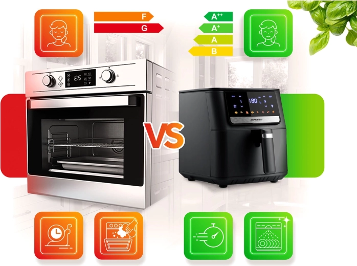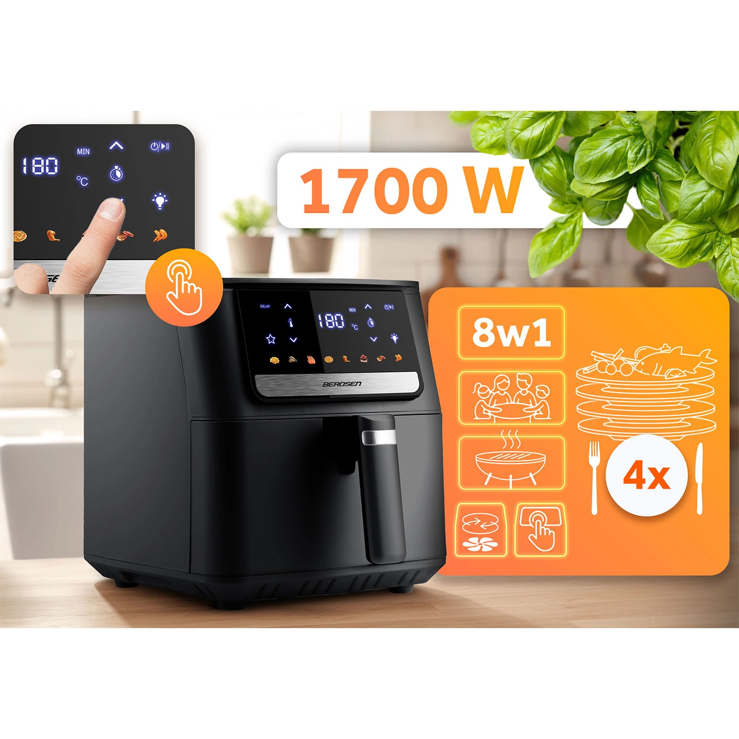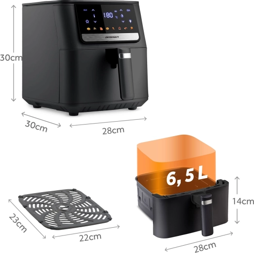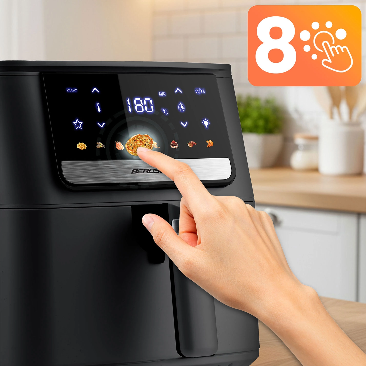 Model BERDSEN BD-662 kombinuje styl a funkčnost: intuitivní dotykový panel s přehlednými ikonami, 8 programů pro hranolky, ryby, kuře, krevety, steaky, koláče, pizzu i křidélka, a nastavení teploty do 200 °C. Díky objemu 6,5 l připravíte večeři pro rodinu, velkou misku hranolků pro přátele nebo dokonce celé kuře. Koš a tác lze mýt v myčce, nechybí automatické vypnutí a ochrana proti přehřátí.