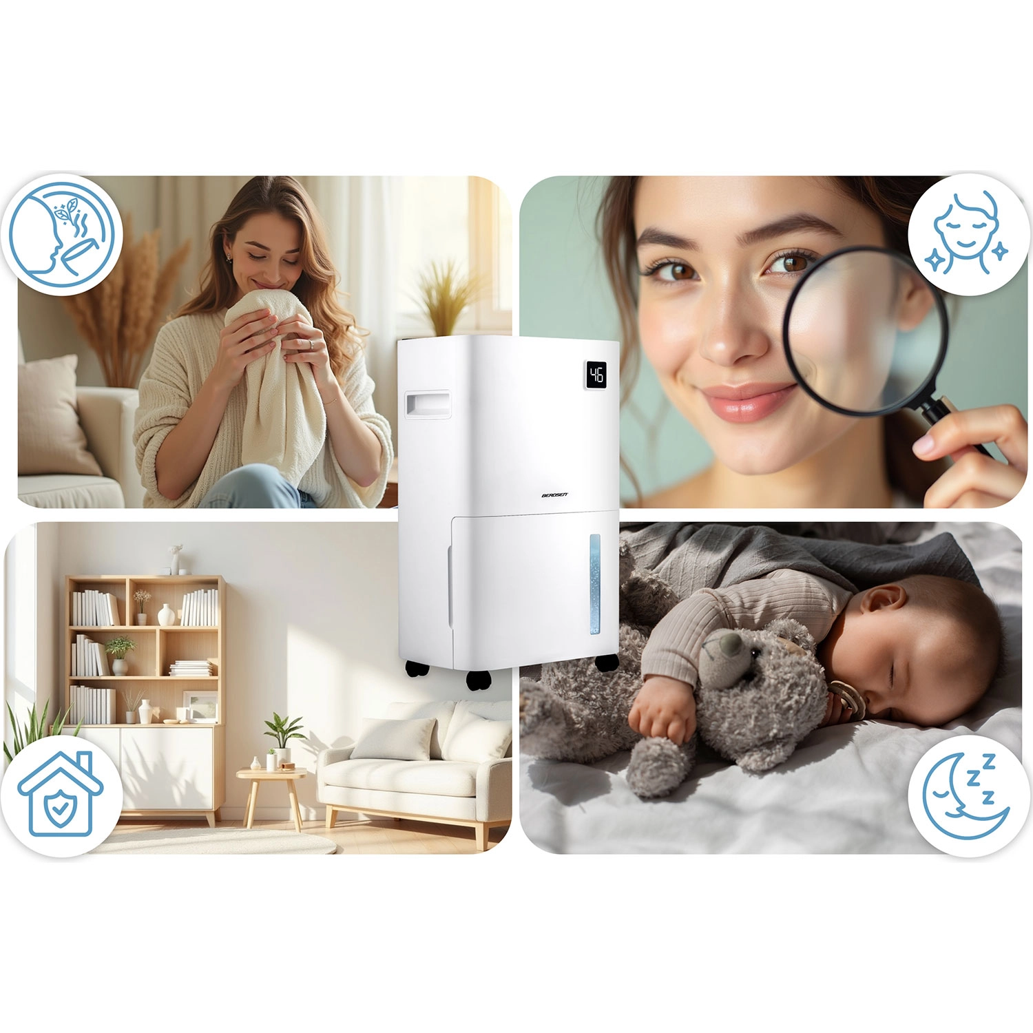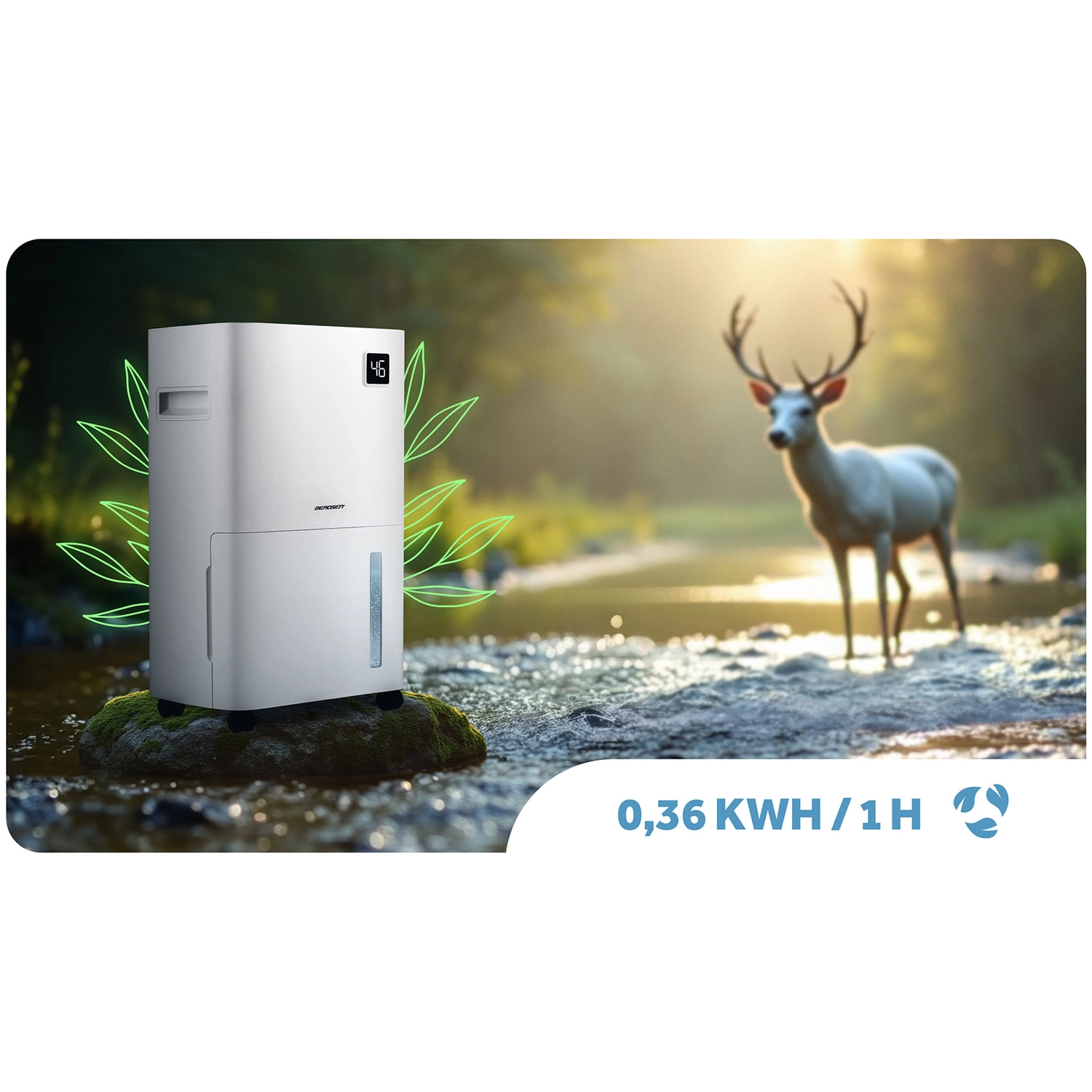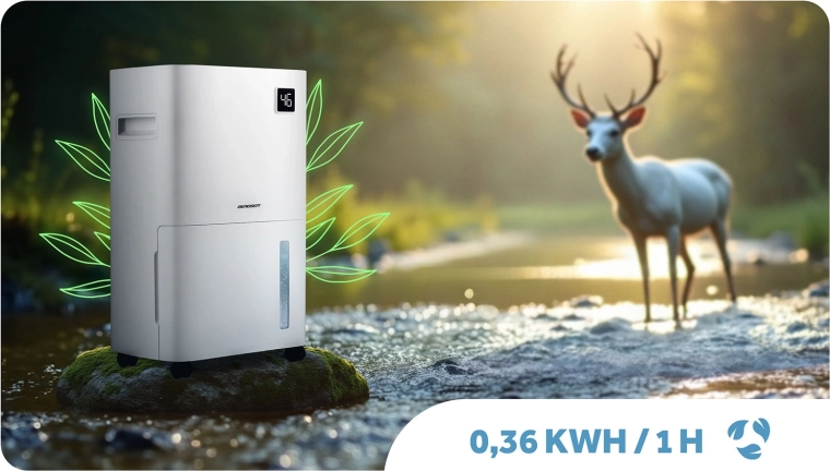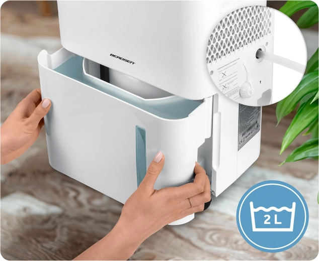 Odvlhčovač BERDSEN pracuje na principu kondenzace a účinně pohlcuje nadbytečnou vlhkost, čímž brání vzniku plísní, bakterií a zatuchlého zápachu. Díky chladivu R290 je šetrný k životnímu prostředí a splňuje evropské normy. Integrovaný hygrostat zobrazuje aktuální vlhkost a umožňuje přesné nastavení v rozmezí 30–80 %.