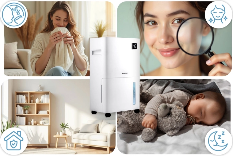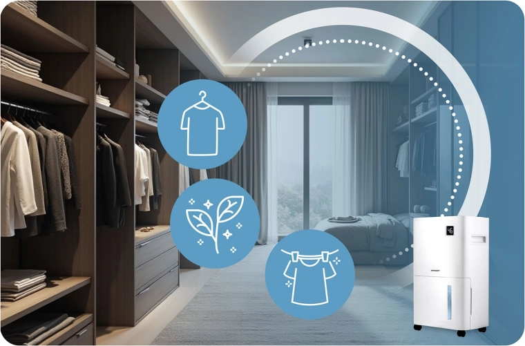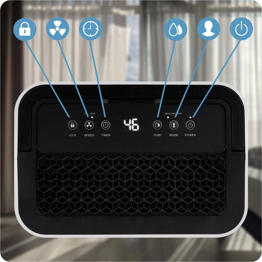 Ovládání přes Wi‑Fi (aplikace Tuya) usnadní nastavení odkudkoli. Vyberte si ze 3 režimů – odvlhčování, kontinuální provoz nebo sušení prádla. Samozřejmostí je automatické odtávání, časovač 24 h, dětská pojistka, paměť nastavení a ochrana proti přeplnění. Kolečka a praktické madlo usnadní přesun mezi místnostmi.