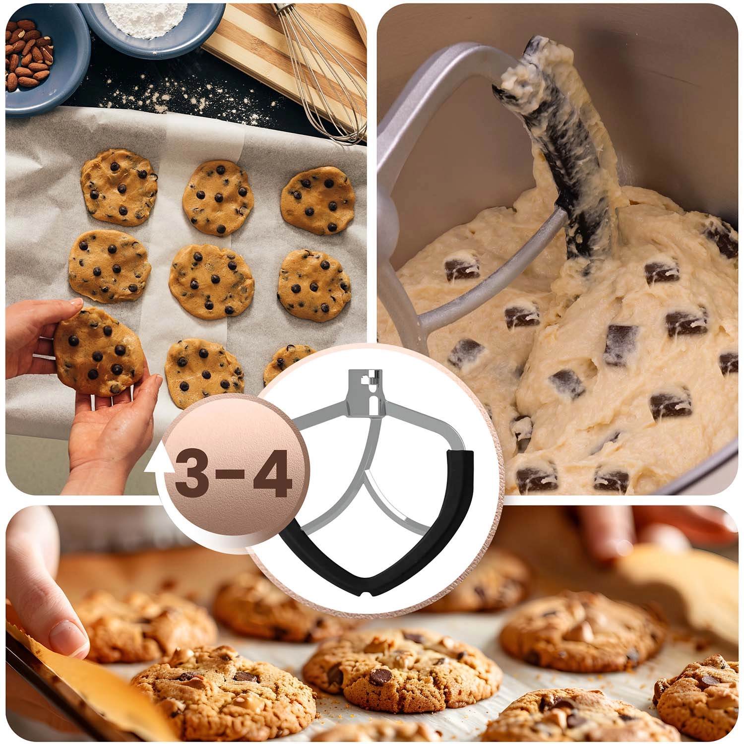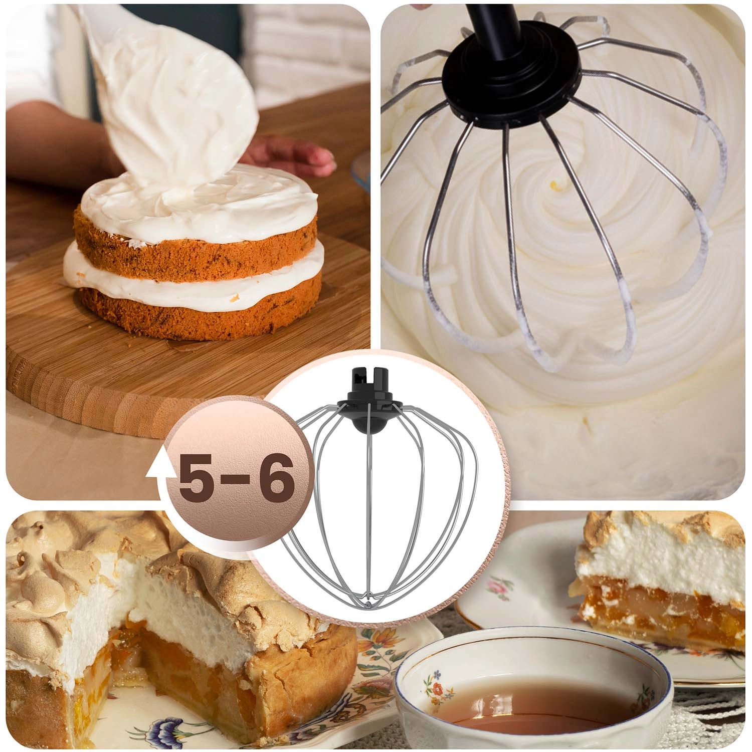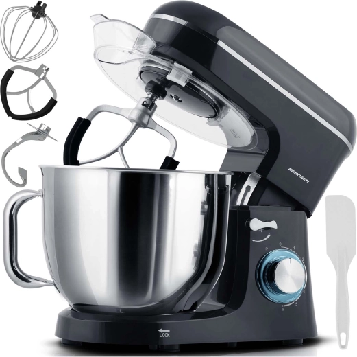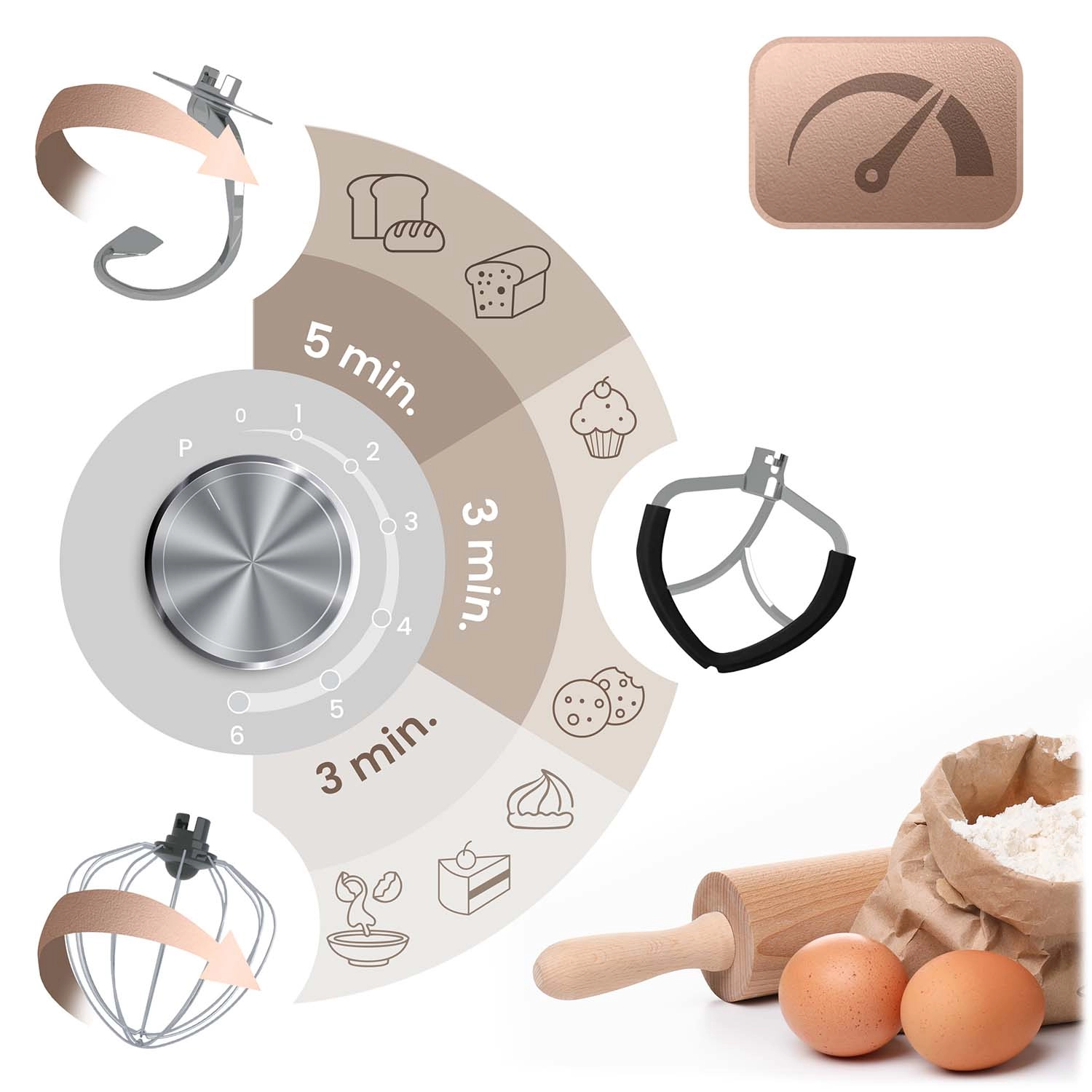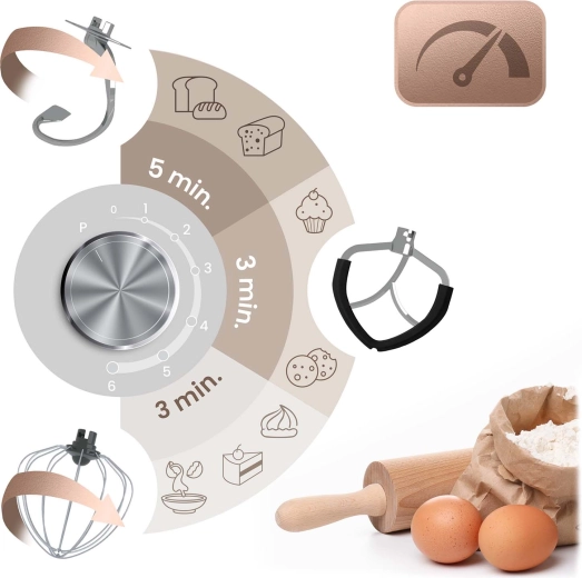 - 3 nástavce v balení: hák na těsto (rychl. 1–3), ploché míchadlo (2–4), šlehací metla (5–6) pro perfektní konzistence od kynutých těst po nadýchané krémy.