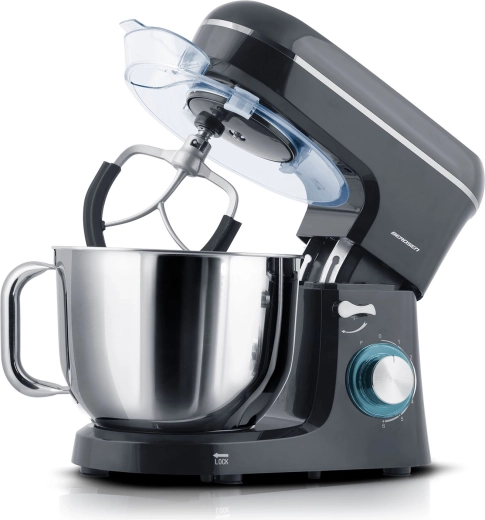 Velká misa z nerezové oceli s držadlem pojme velké dávky těsta i krémů. Splash guard s dvířky umožní dolévat suroviny bez nepořádku.