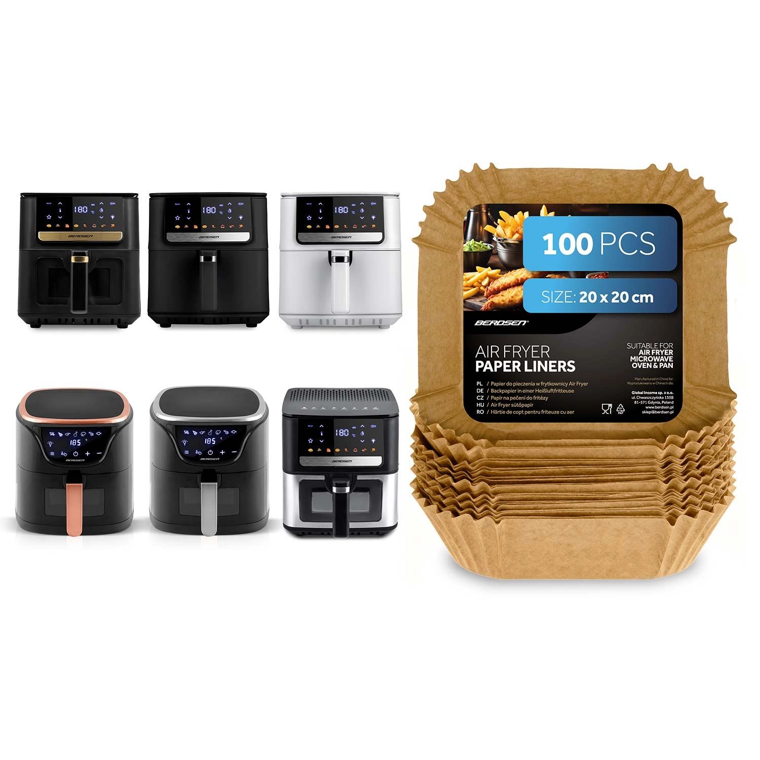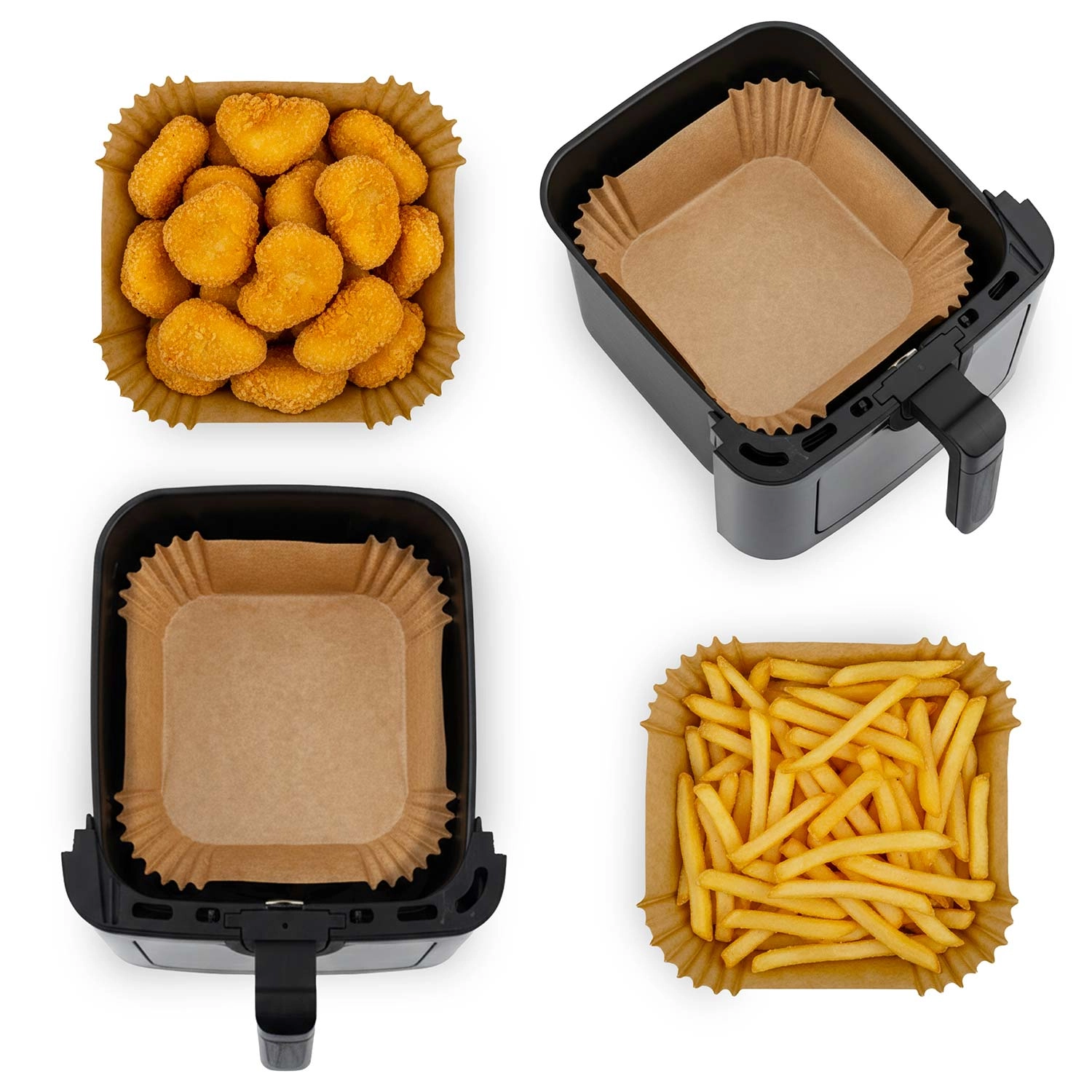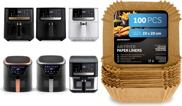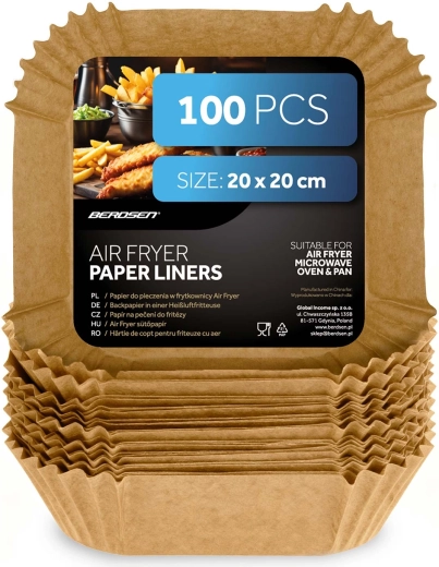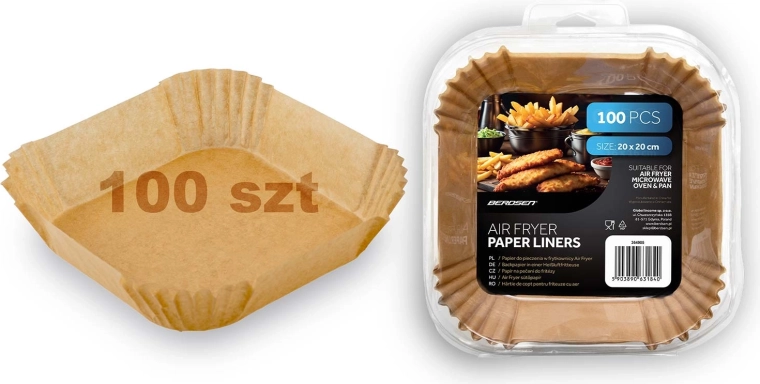 Čtvercové papírové vložky 20 × 20 cm jsou ideální pro horkovzdušné fritézy, ale také do mikrovlnné trouby, klasické trouby či pánve. Jednorázové provedení a nepřilnavý povrch usnadňují vyjímání jídla a udržují spotřebiče hygienicky čisté. Vhodné pro hranolky, kuřecí křidélka, nugety i pečivo.