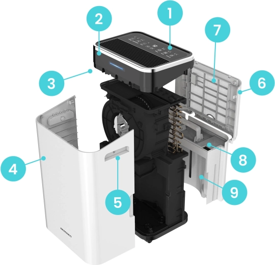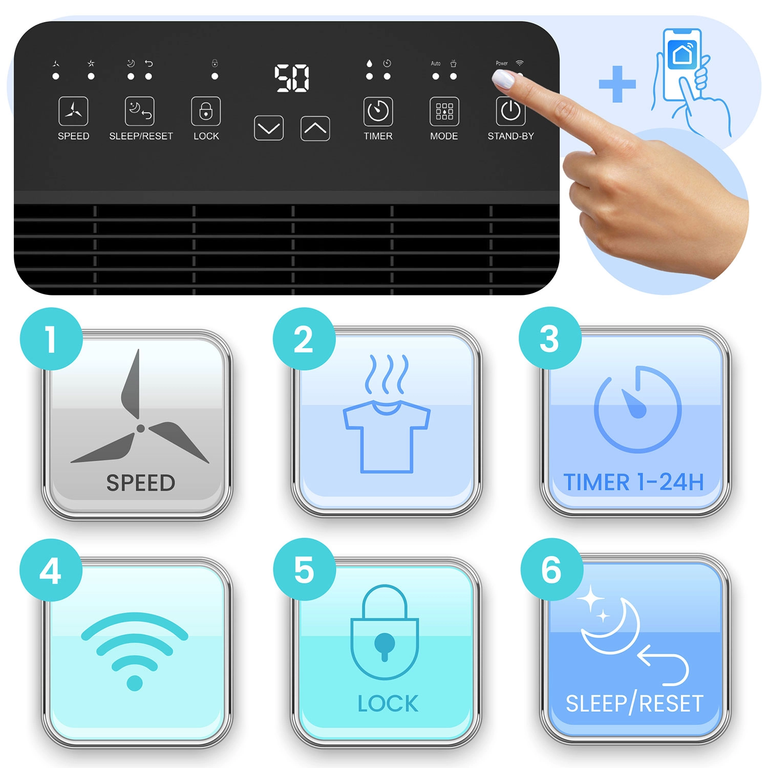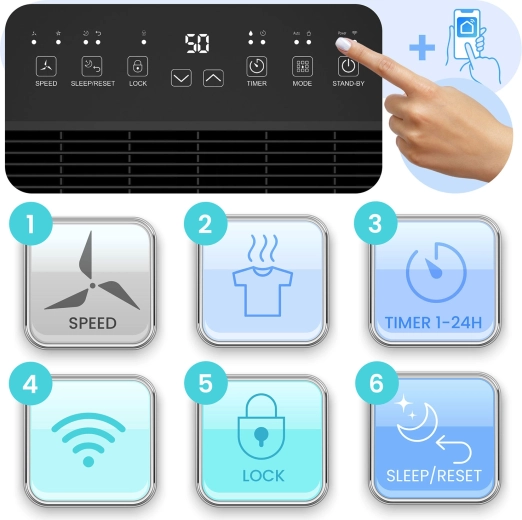 Intuitivní dotykový panel doplňuje Wi‑Fi řízení v aplikaci Tuya/Smart Life. Snadno nastavíte auto režim, nepřetržité odvlhčování, sleep nebo sušení prádla. Barevný LED indikátor (červená/zelená/modrá) jasně ukazuje aktuální úroveň vlhkosti a časovač 1–24 h spolu s dětským zámkem zvyšují bezpečnost i komfort.