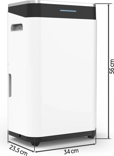 Kompaktní tělo ukrývá extra velký zásobník 6,5 l pro méně časté vylévání. Pro nepřetržitý provoz bez starostí využijete trvalý odvod vody. Nízká hlučnost do 45 dB(A), praktické madlo a kolečka usnadňují každodenní používání.