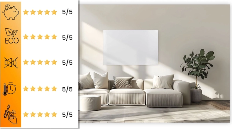 Integrovaný termostat a dvojitá ochrana proti přehřátí hlídají bezpečný provoz. Efektivní sálavé vytápění pomáhá snižovat spotřebu energie oproti klasickým konvekčním radiátorům a přináší příjemné, přirozené klima bez vysušování vzduchu.