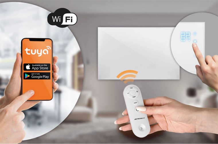 Vyberte si způsob, který vám vyhovuje: jemný dotykový panel LED, praktický dálkový ovladač nebo mobilní aplikaci TUYA přes Wi‑Fi. Nastavíte teplotu 16–37 °C, časovač 1–9 hodin a týdenní harmonogram pro chytré řízení spotřeby a návrat do příjemně vyhřátého domova.