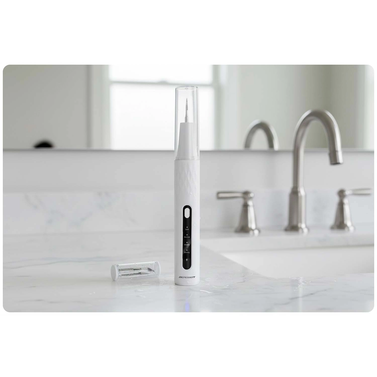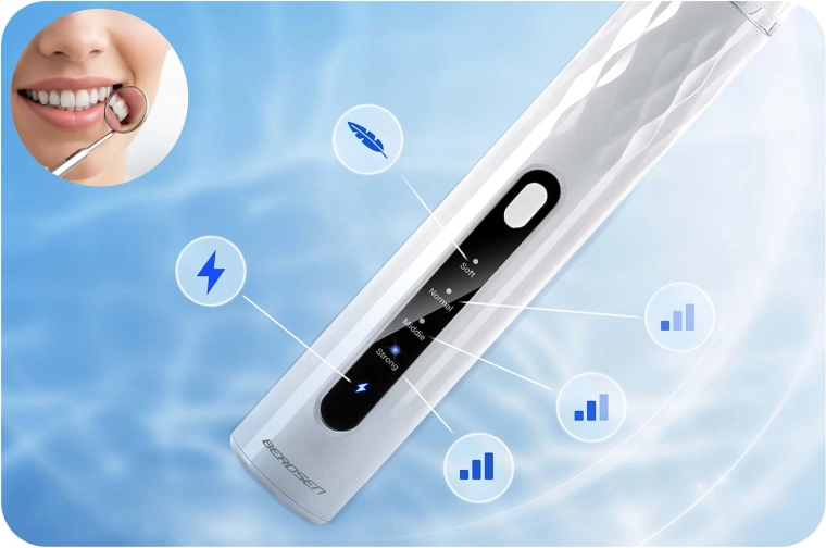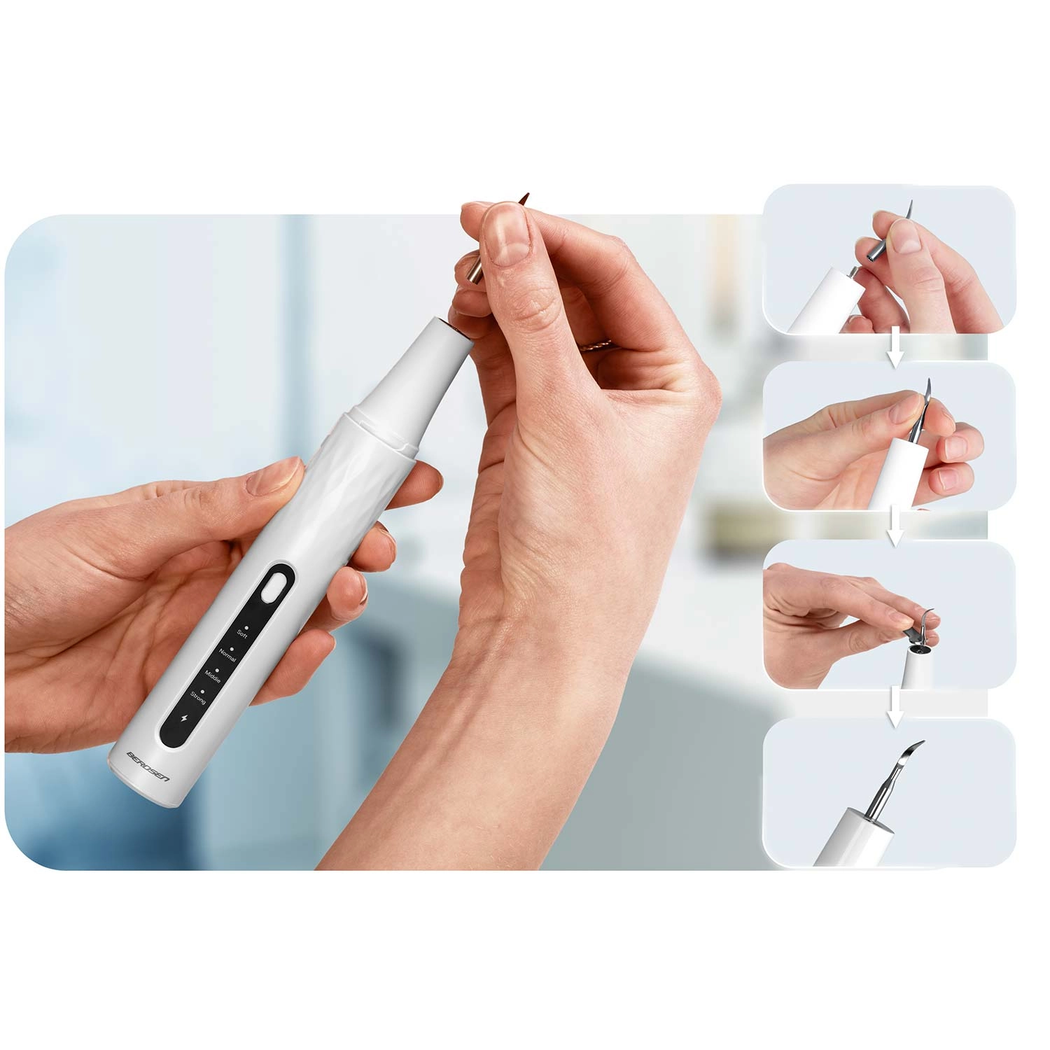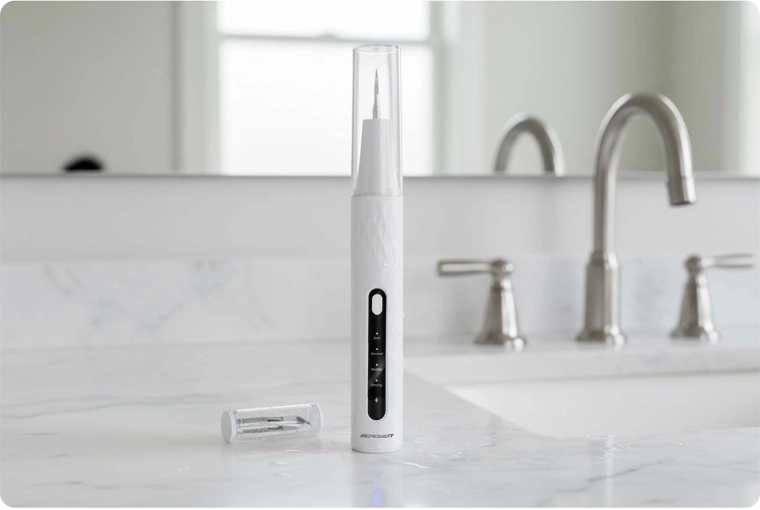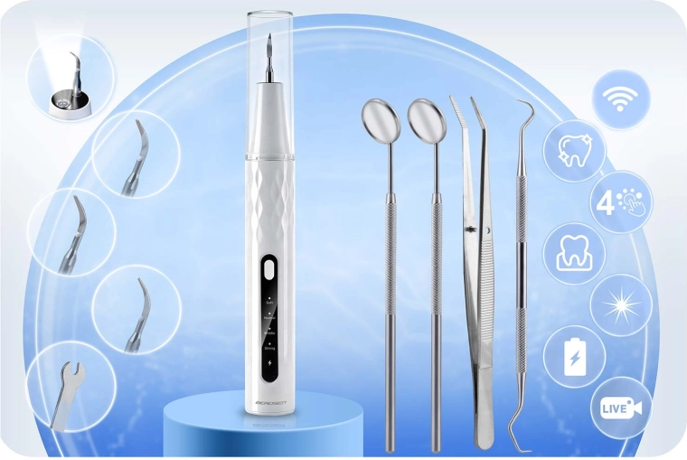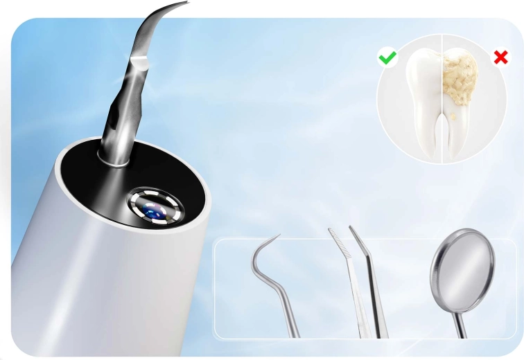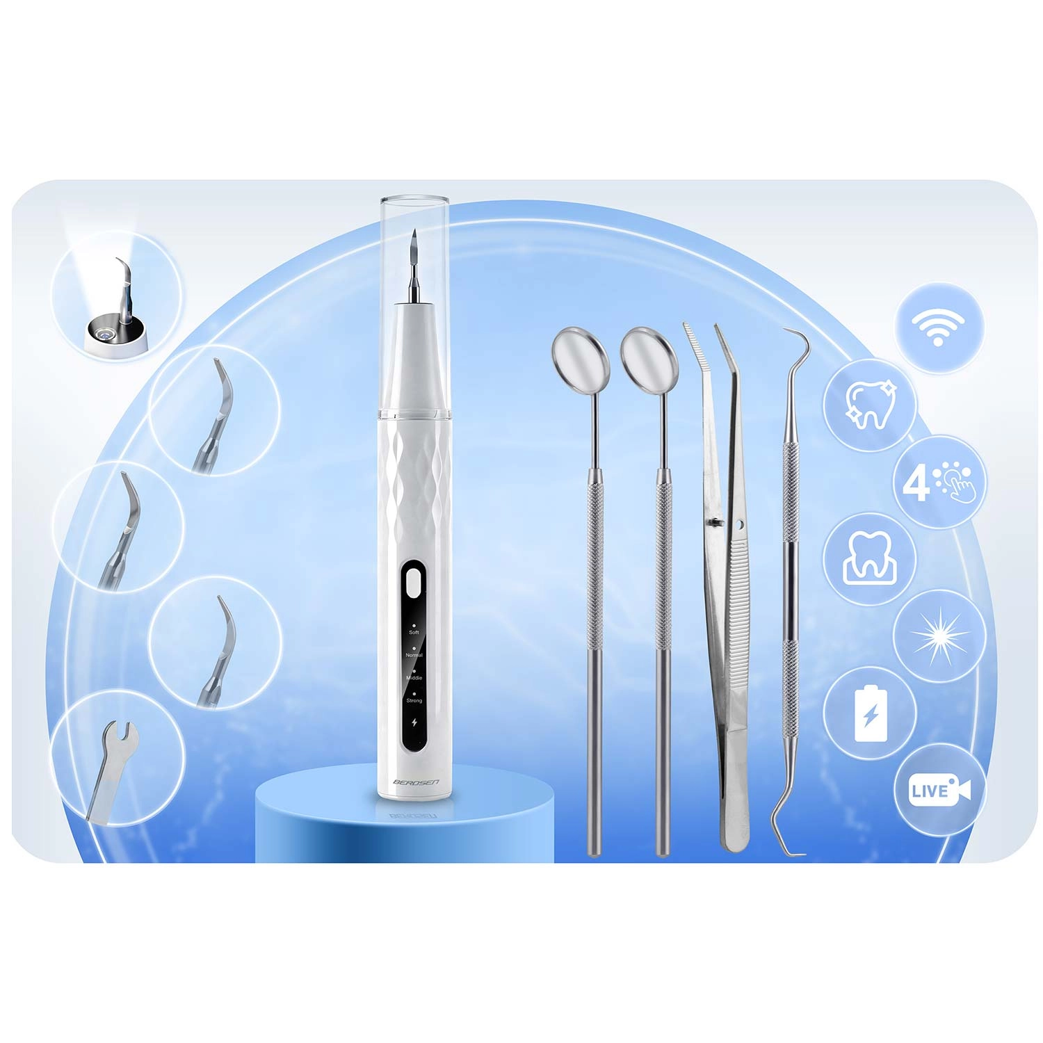 Domácí péče o zuby na profesionální úrovni. Ultrazvukový skaler BERDSEN s integrovanou kamerou 2 Mpx a LED osvětlením vám umožní přesně vidět místa s zubním kamenem a povlakem. Nabízí 4 pracovní režimy (35–45 kHz) pro všechny citlivosti, automatické zastavení při dotyku měkké tkáně, IPX7 voděodolnost, dlouhou výdrž baterie s nabíjením USB‑C a bohaté příslušenství včetně 4 vyměnitelných hlavic a sady nerezových dentálních nástrojů. Ideální pro bezpečné a účinné čištění v pohodlí domova.