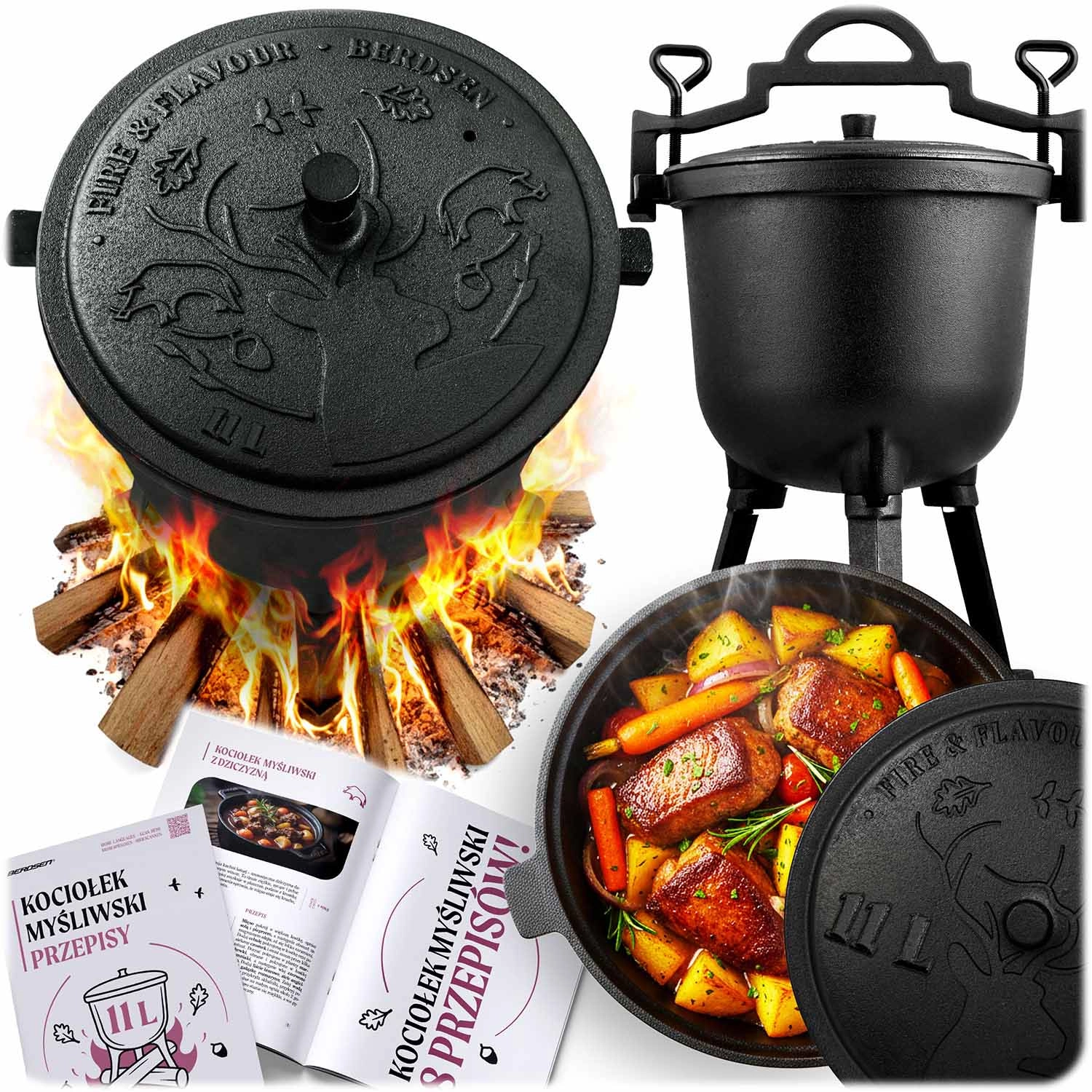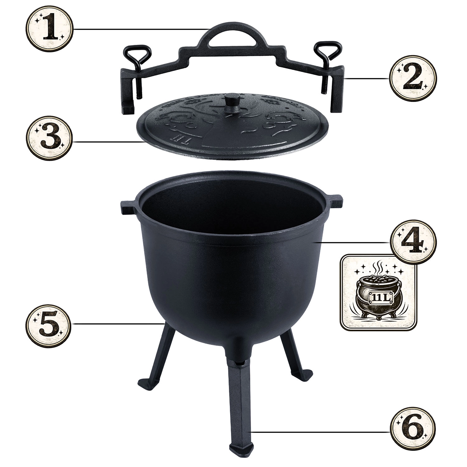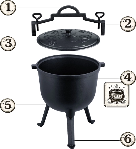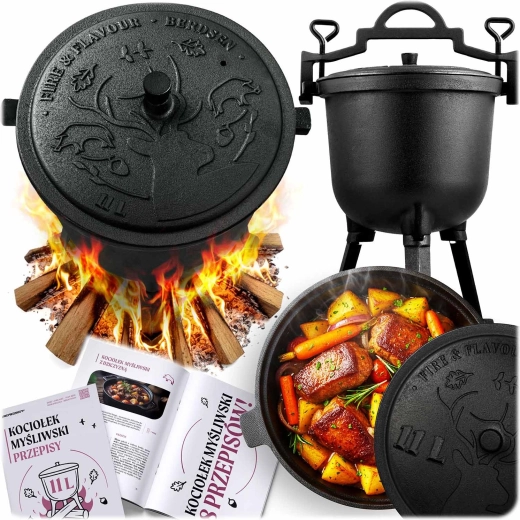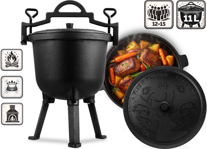 Objevte poctivé venkovní vaření s robustním kotlíkem z litiny o objemu 11 l. Díky silným stěnám skvěle akumuluje teplo, vaří rovnoměrně bez připálení a vykouzlí hlubokou chuť gulášů, pečonek i polévek. S víkem s odvětráním, odnímatelnými nohami a úchopem pro zavěšení je připravený pro oheň, gril i plynový vařič.