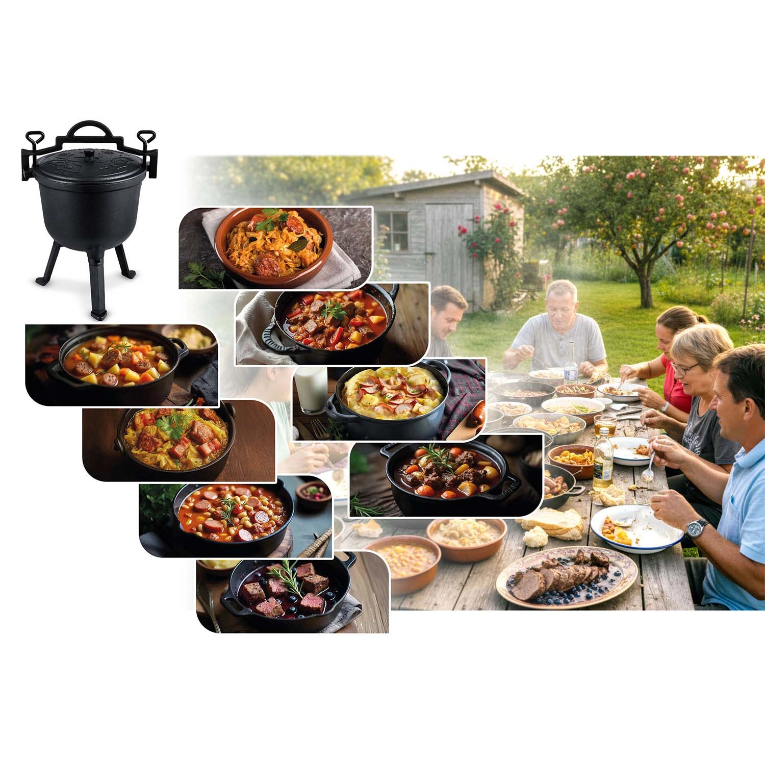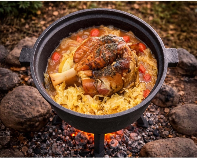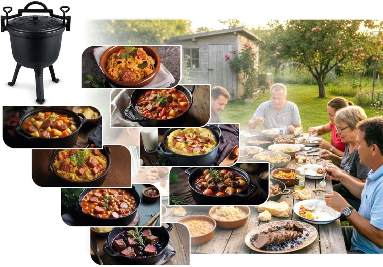 Tradiční litinový kotlík je ideální pro otevřený oheň, zahradní gril i plynový sporák. Masivní konstrukce zajišťuje stabilitu, dlouhé držení tepla a pozvolné dušení – maso se krásně rozpadá a zelenina nasákne chutí. Těžké víko s odvětráním udržuje páru i aroma uvnitř, takže výsledek je vždy šťavnatý a plný chuti.