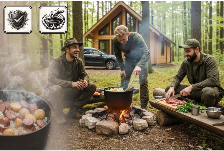 Promyšlené detaily usnadní každé vaření venku: pevný rámový úchyt pro zavěšení nad ohněm, šroubované nožky pro rychlou montáž a stabilní oporu i v nerovném terénu. Kotlík můžete používat třemi způsoby – postavit na nožky k ohni, zavěsit na trojnožku nebo sejmout nožky a vařit na plynu.