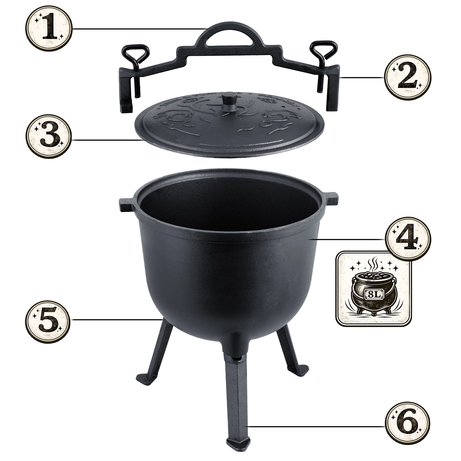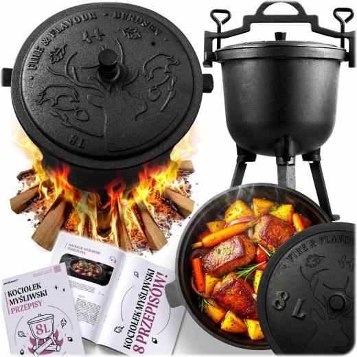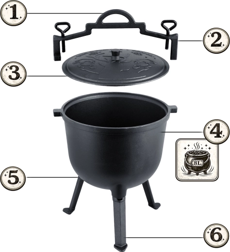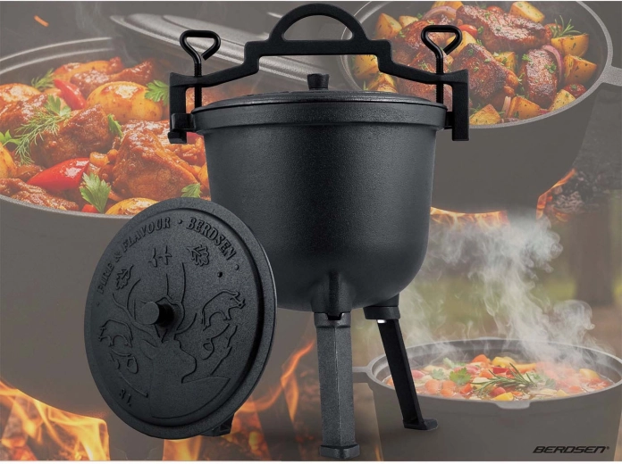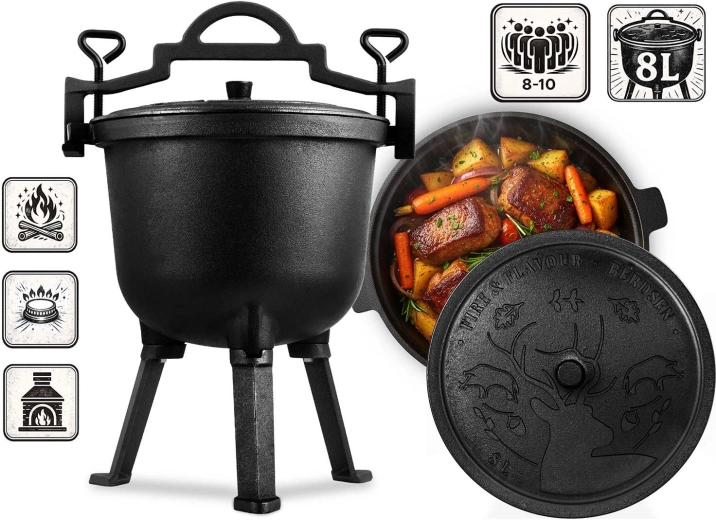 Velký objem 8 l nasytí rodinu i přátele. Skvěle funguje v létě u grilu i v zimě u ohně – pro guláš, pečínky a syté polévky.