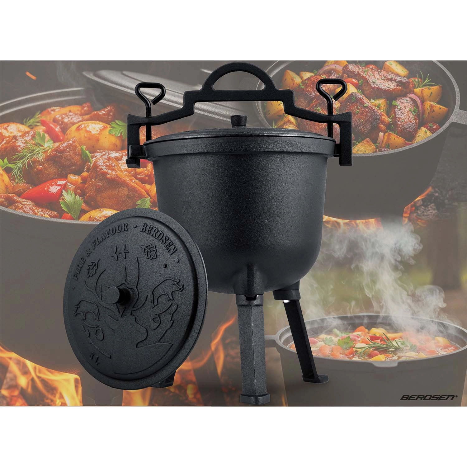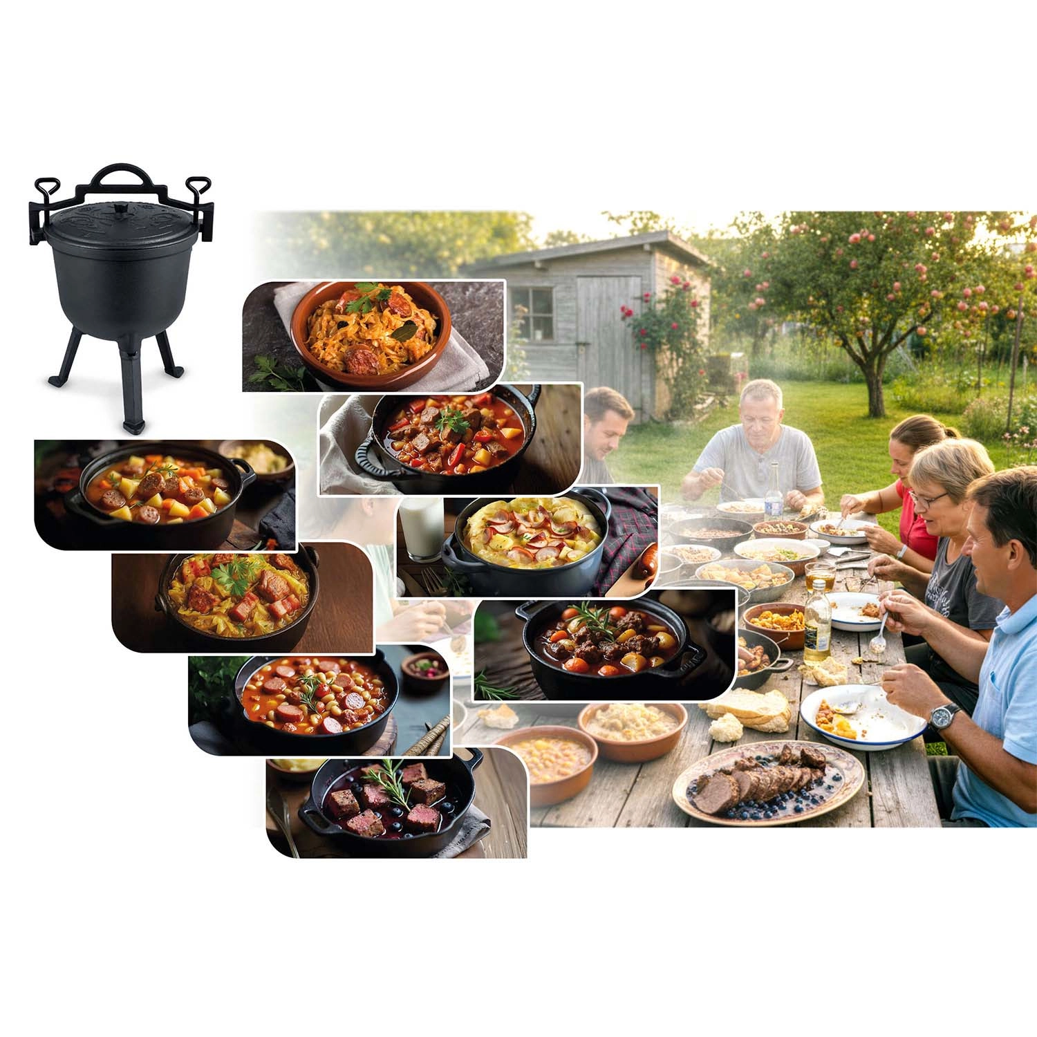 Tradiční litinový kotlík 8 l je ideální pro vaření na ohni, v krbu i na grilu. Masivní litina skvěle akumuluje a rovnoměrně předává teplo od dna až po víko, takže jídlo pozvolna probublává a získává intenzivní, poctivou chuť. Silné stěny brání připékání a udrží teplotu opravdu dlouho.