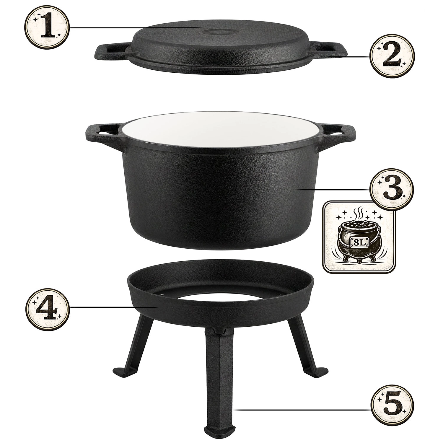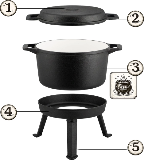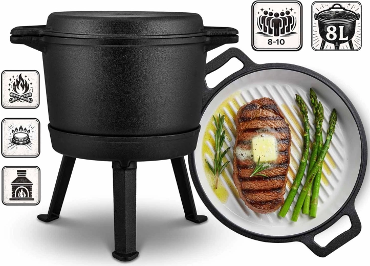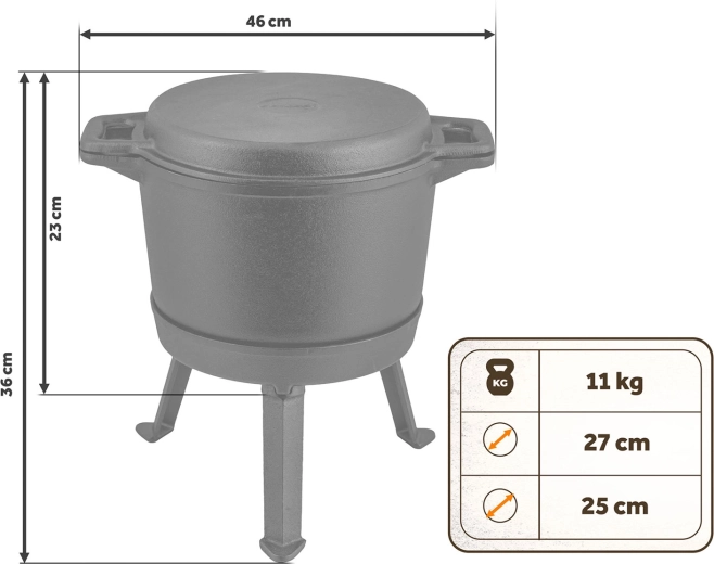 Součástí je trojnožka s pevnými patkami a jednoduchým upevněním korpusu pomocí tří šroubů pro jistotu nad plamenem i na nerovném povrchu. Oboustranné víko/pánev rozšiřuje možnosti přípravy – od křupavého grilování až po přikrytí pokrmu pro pozvolné vaření. Praktické boční úchyty usnadní manipulaci i servírování.