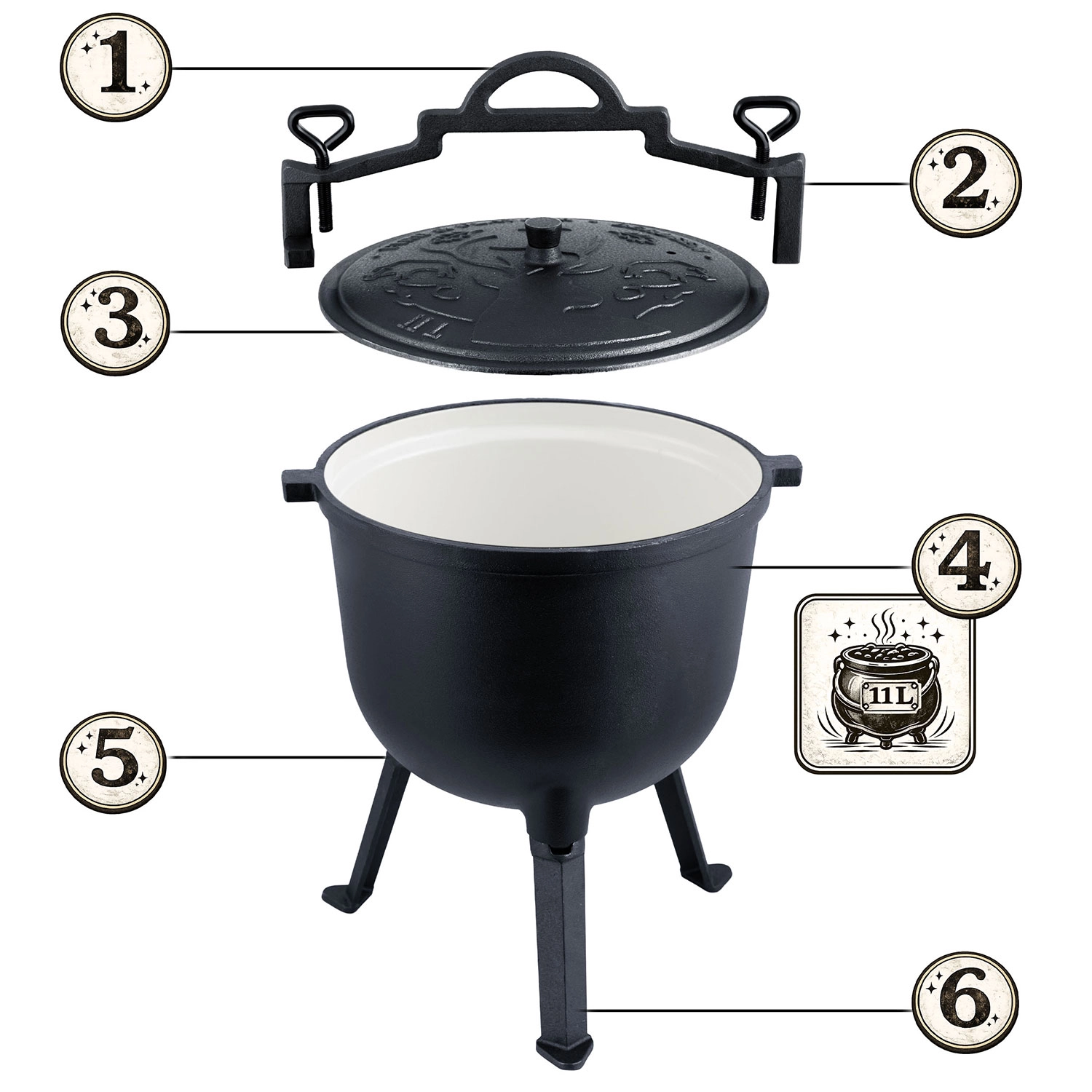 Pevná trojnožka se šroubovanými, odnímatelnými nohami zajišťuje stabilitu i na nerovném povrchu. Kotlík můžete také snadno zavěsit na hák nad plameny.